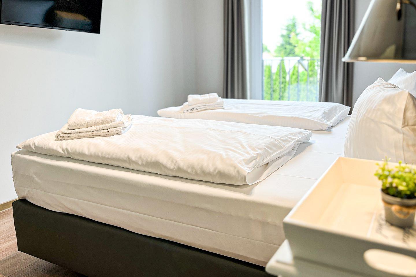 Im separaten Schlafzimmer findest Du ein Doppelbett (2x 90x200?cm) sowie einen zweiten TV – ideal für entspannte Abende im Bett.