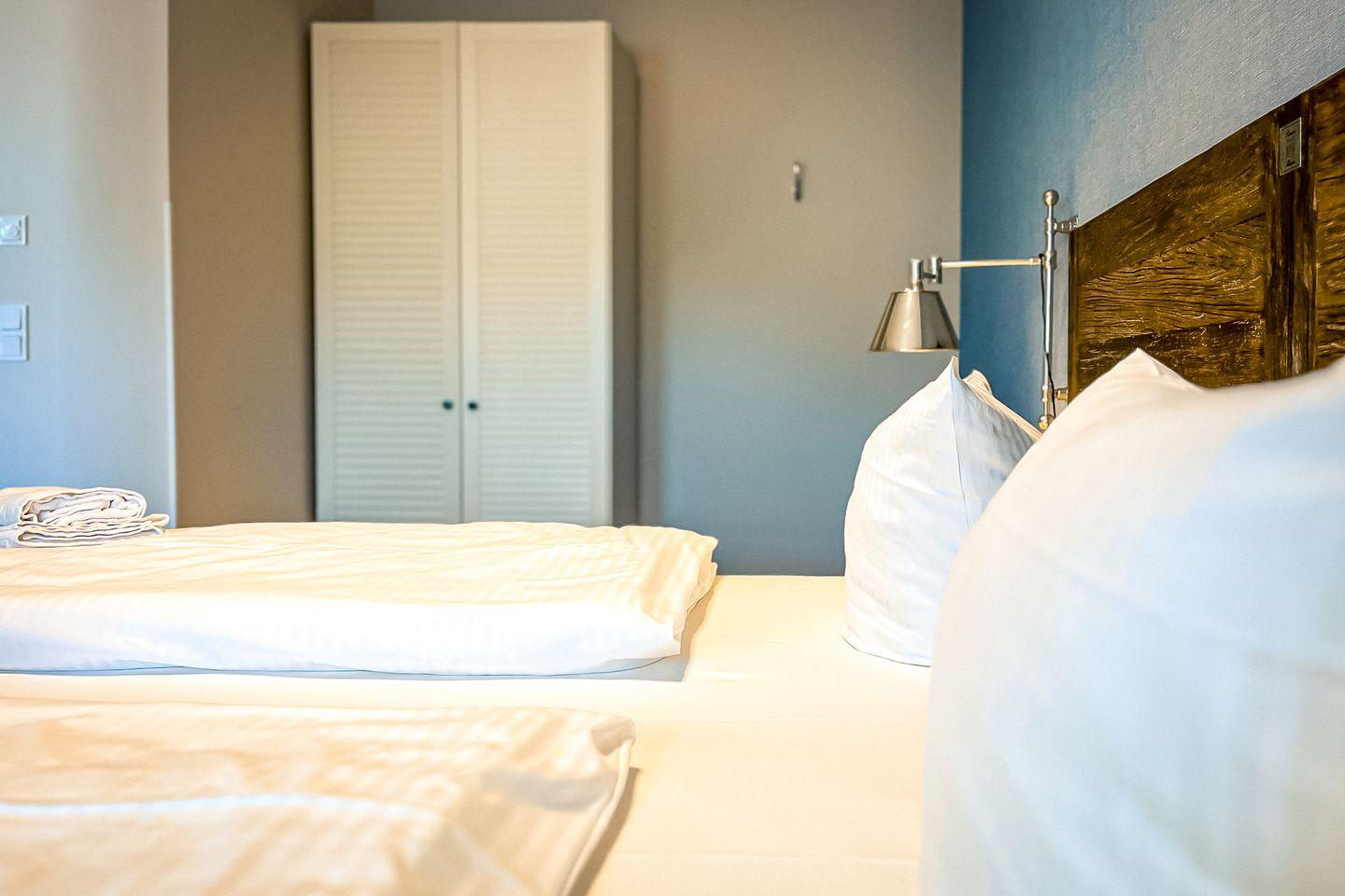 In den separaten Schlafzimmern erwarten Dich je ein bequemes Doppelbett (2x 90x200?cm) für erholsame Nächte. Ein Kleiderschrank für Deine Urlaubsgarderobe ist natürlich auch vorhanden.