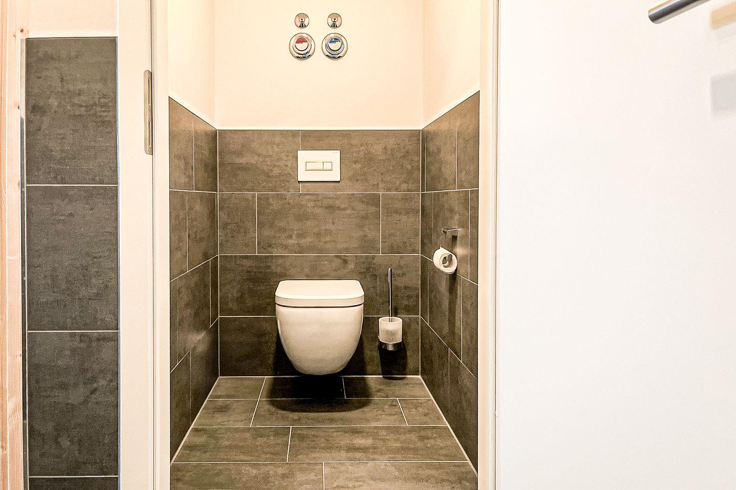 Das Badezimmer ist großzügig geschnitten und mit einer bodengleichen Dusche sowie einer Badewanne ausgestattet – perfekt für entspannende Momente nach einem Strandspaziergang. Das WC ist zusätzlich separiert.