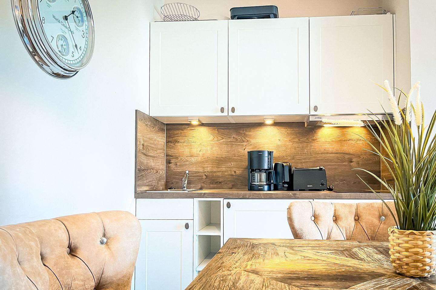 Die offene Küche ist in den Wohnbereich integriert und bietet alles, was Du für einen sorgenfreien Aufenthalt brauchst: Cerankochfeld, Backofen, Kühlschrank mit Gefrierfach, Kaffeemaschine, Wasserkocher, Toaster sowie umfangreiches Koch- und Essgeschirr.