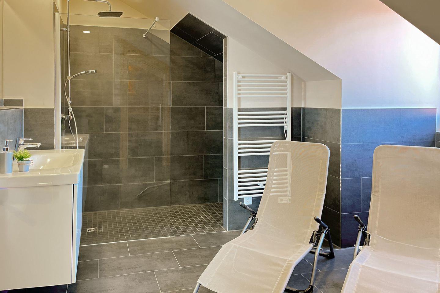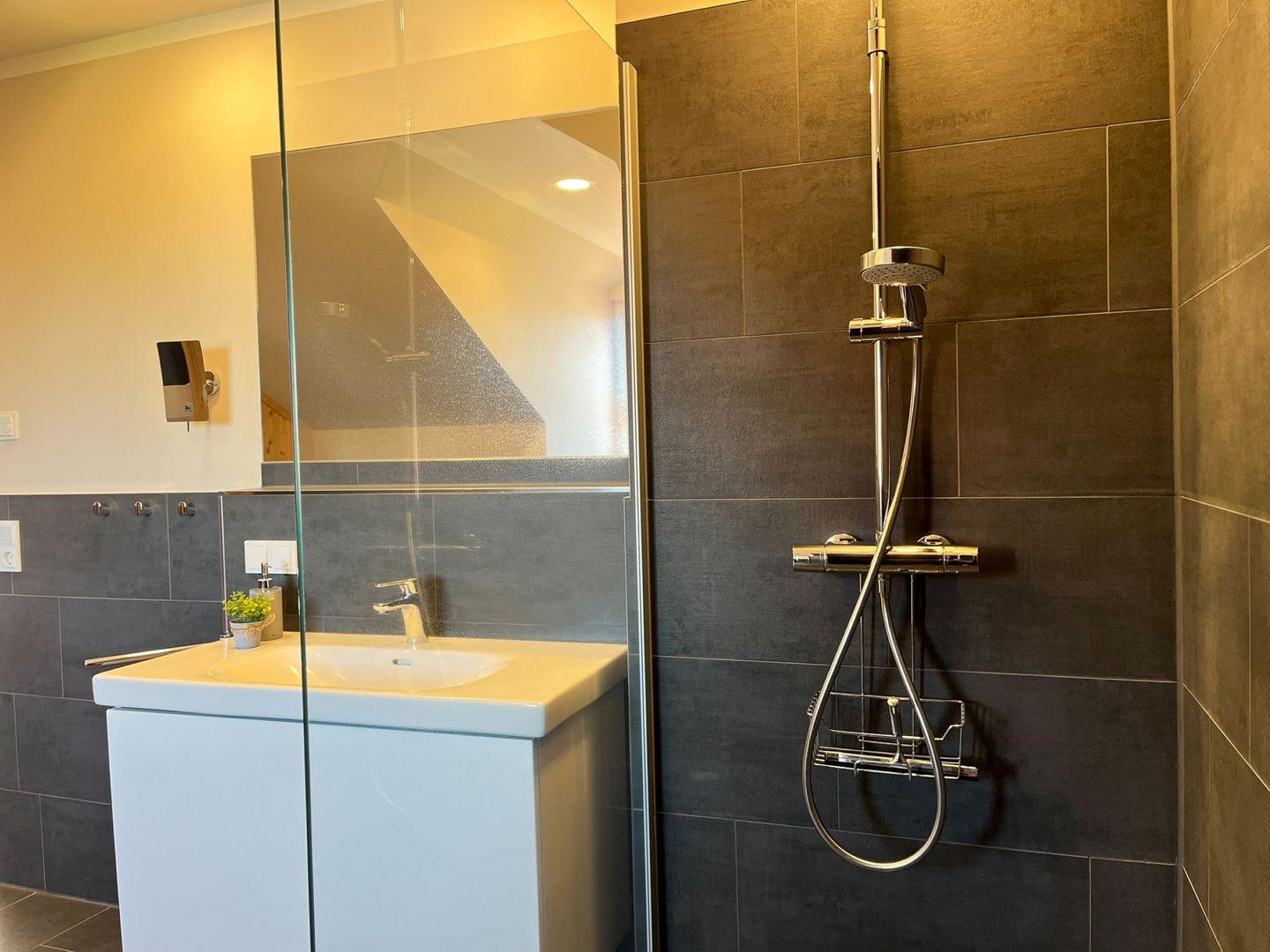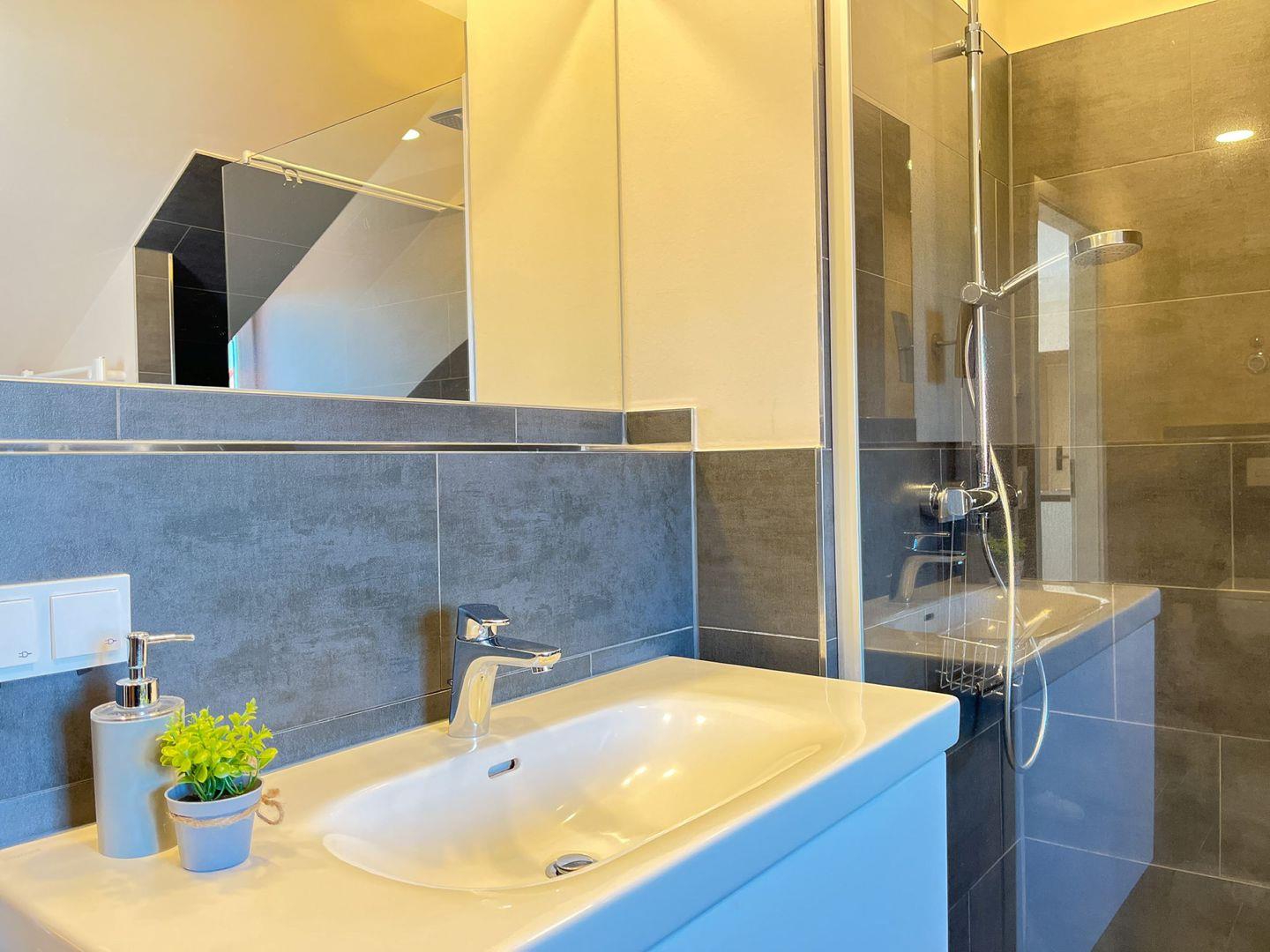 Das moderne Badezimmer verfügt über eine bodengleiche Dusche, WC, Waschbecken, Kosmetikspiegel und Haartrockner – optimal für Deinen Start in den Tag.