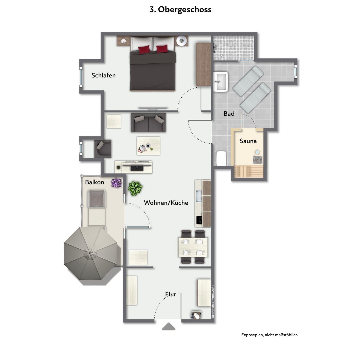Die Ferienwohnung Nr. 64 in der strandnahen Anlage Baltischer Hof ist eine 2-Zimmer-Wohnung für bis zu 4 Personen und liegt im 3. Obergeschoss. Sie verfügt über ein Wohnzimmer mit Schlafcouch und integrierter Küchenzeile inkl. Spülmaschine, ein Bad mit Dusche, eine private Sauna, ein Schlafzimmer und eine Dachterrasse.