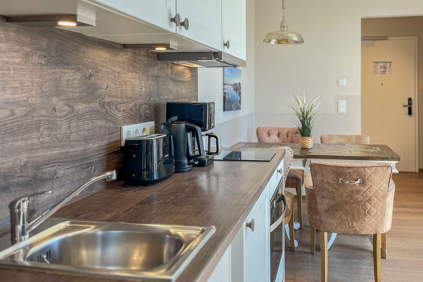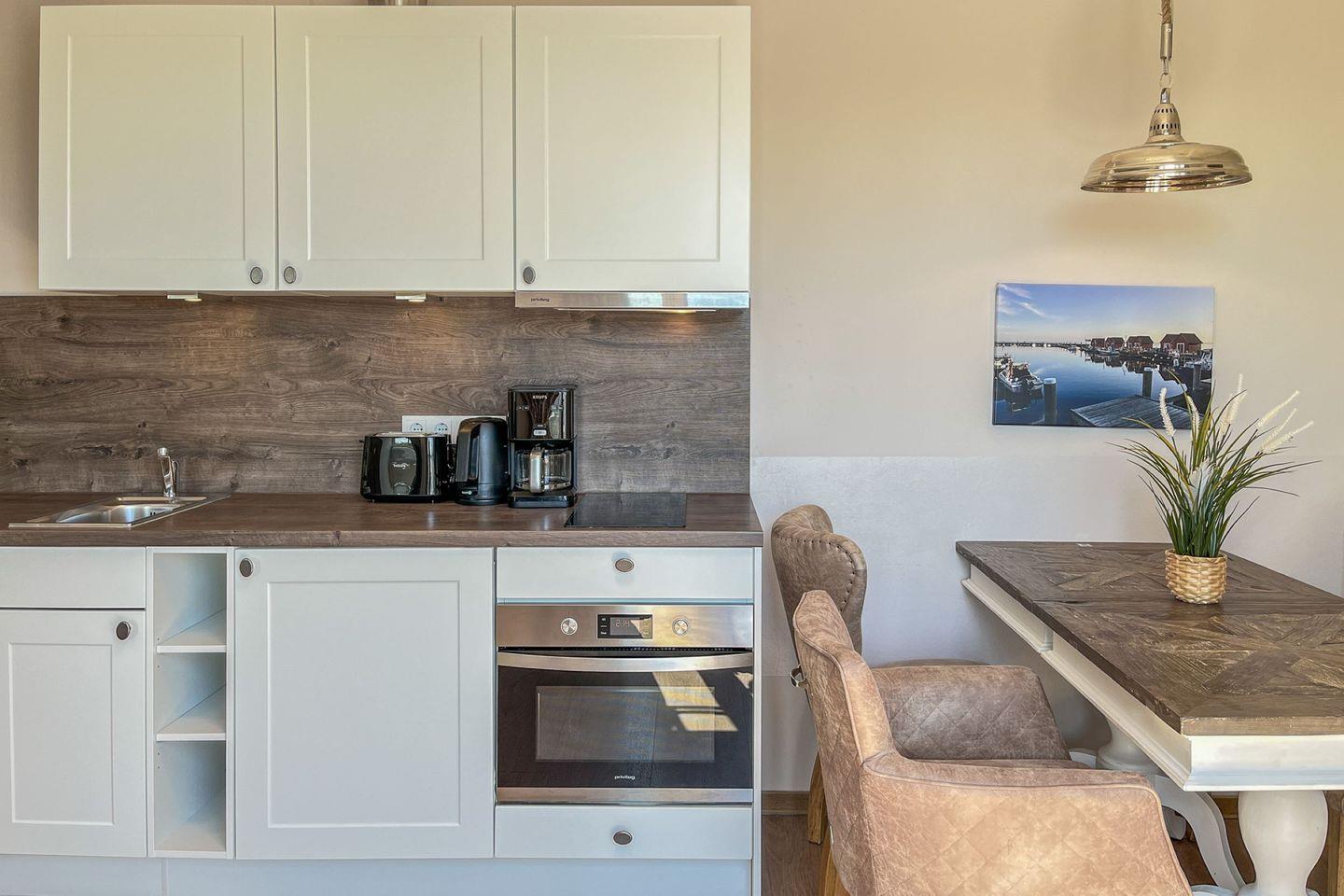 Die modern eingerichtete Küche ist bestens ausgestattet: Cerankochfeld, Backofen, Kühlschrank mit Gefrierfach, Spülmaschine, Kaffeemaschine, Wasserkocher, Toaster, Küchenutensilien sowie Geschirr und Besteck stehen für Deine Selbstverpflegung bereit.