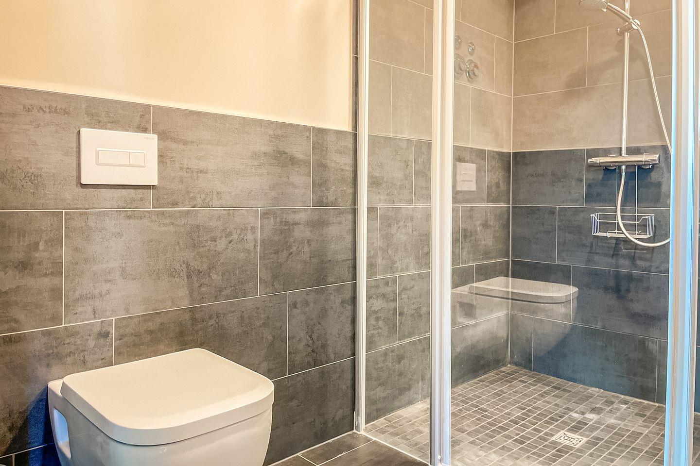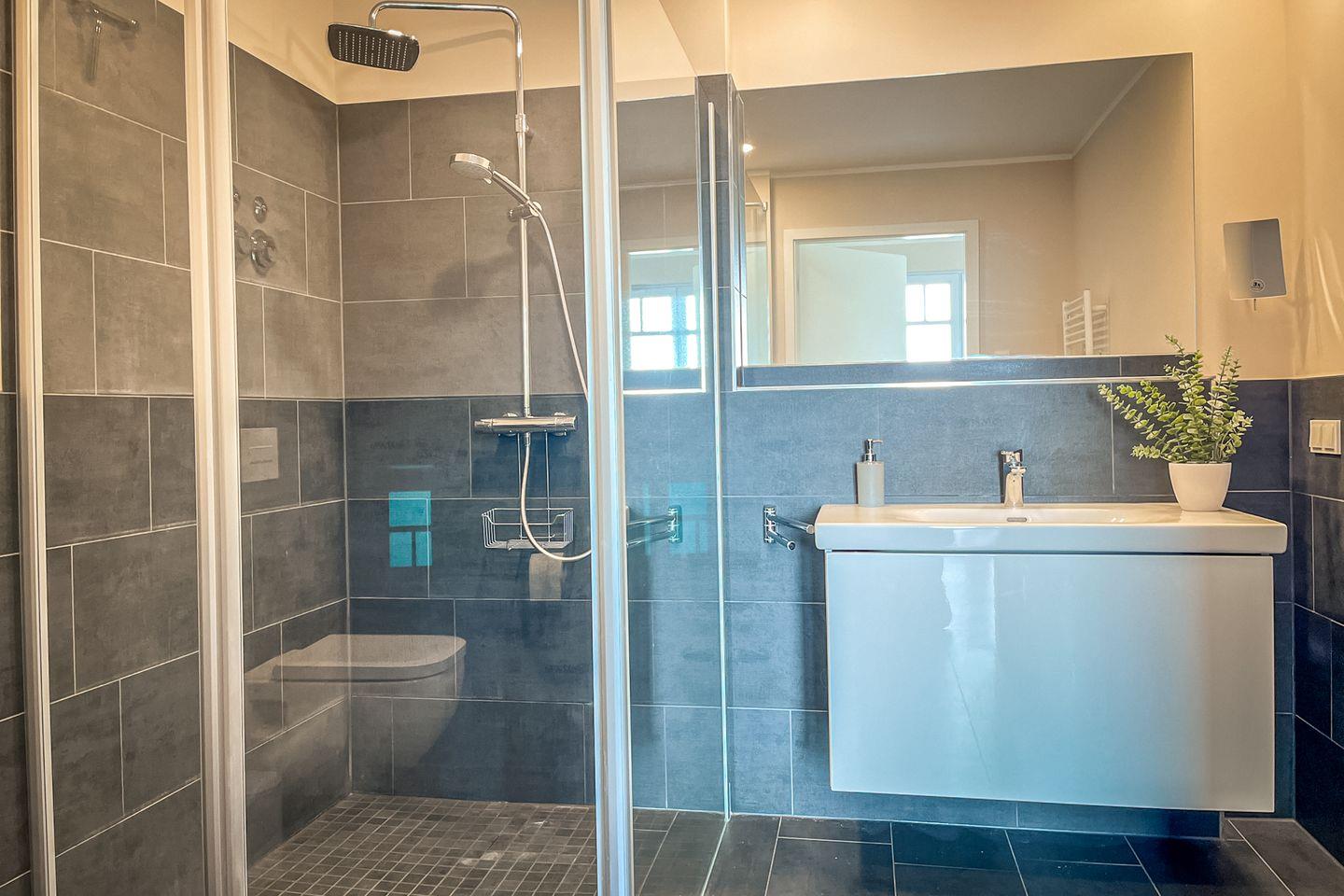 Das Badezimmer ist mit bodengleicher Dusche, WC, Waschbecken, Kosmetikspiegel und Haartrockner ausgestattet – alles für Deinen täglichen Komfort.