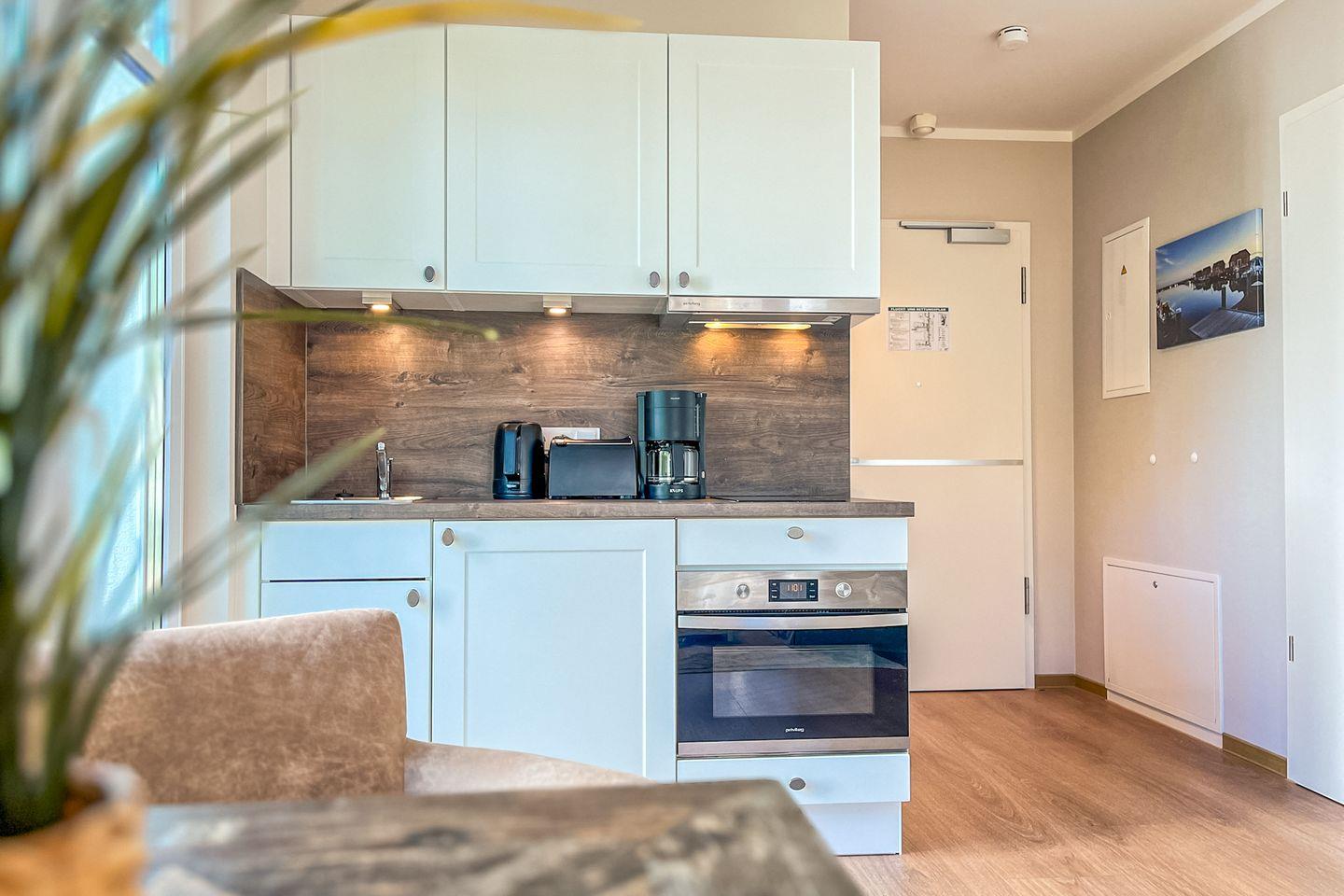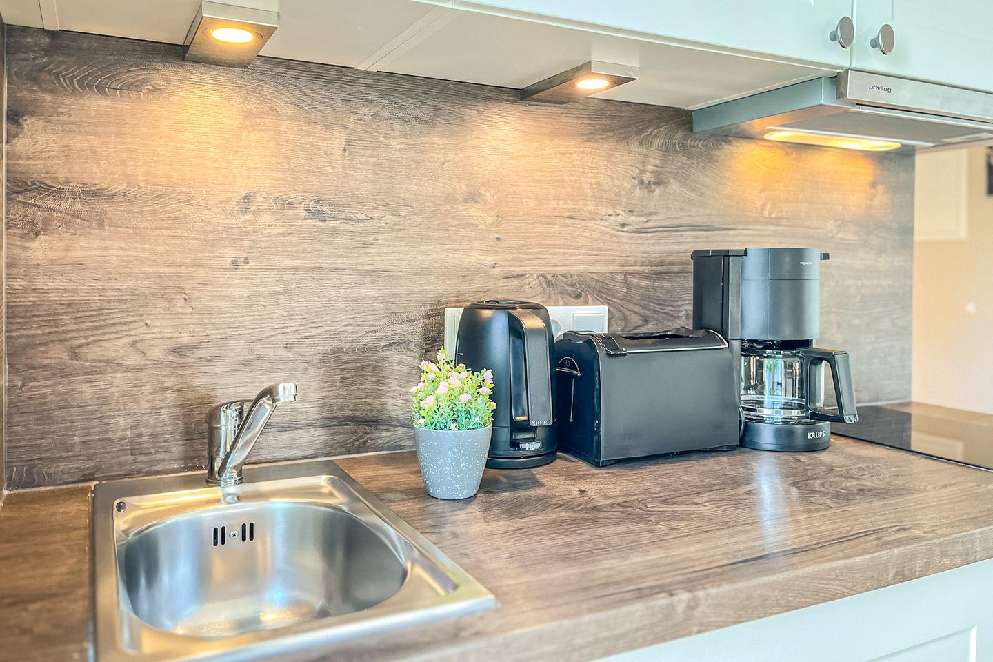 Die gut ausgestattete Küche ist offen zum Wohnbereich und bietet alles, was Du für Deinen Urlaub brauchst: Cerankochfeld, Backofen, Kühlschrank mit Gefrierfach, Kaffeemaschine, Wasserkocher, Toaster sowie Koch- und Essgeschirr.