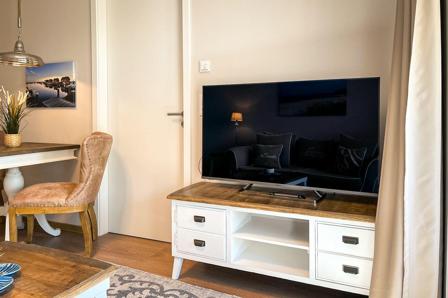Im offenen Wohnbereich laden ein bequemes Sofa und ein moderner Flachbild-TV zum Entspannen ein. Der angrenzende Essplatz bietet Platz für zwei Personen.