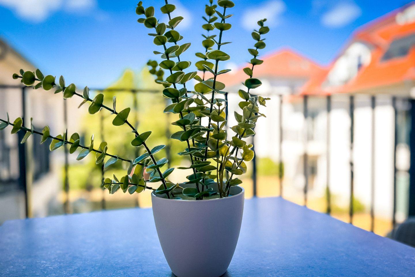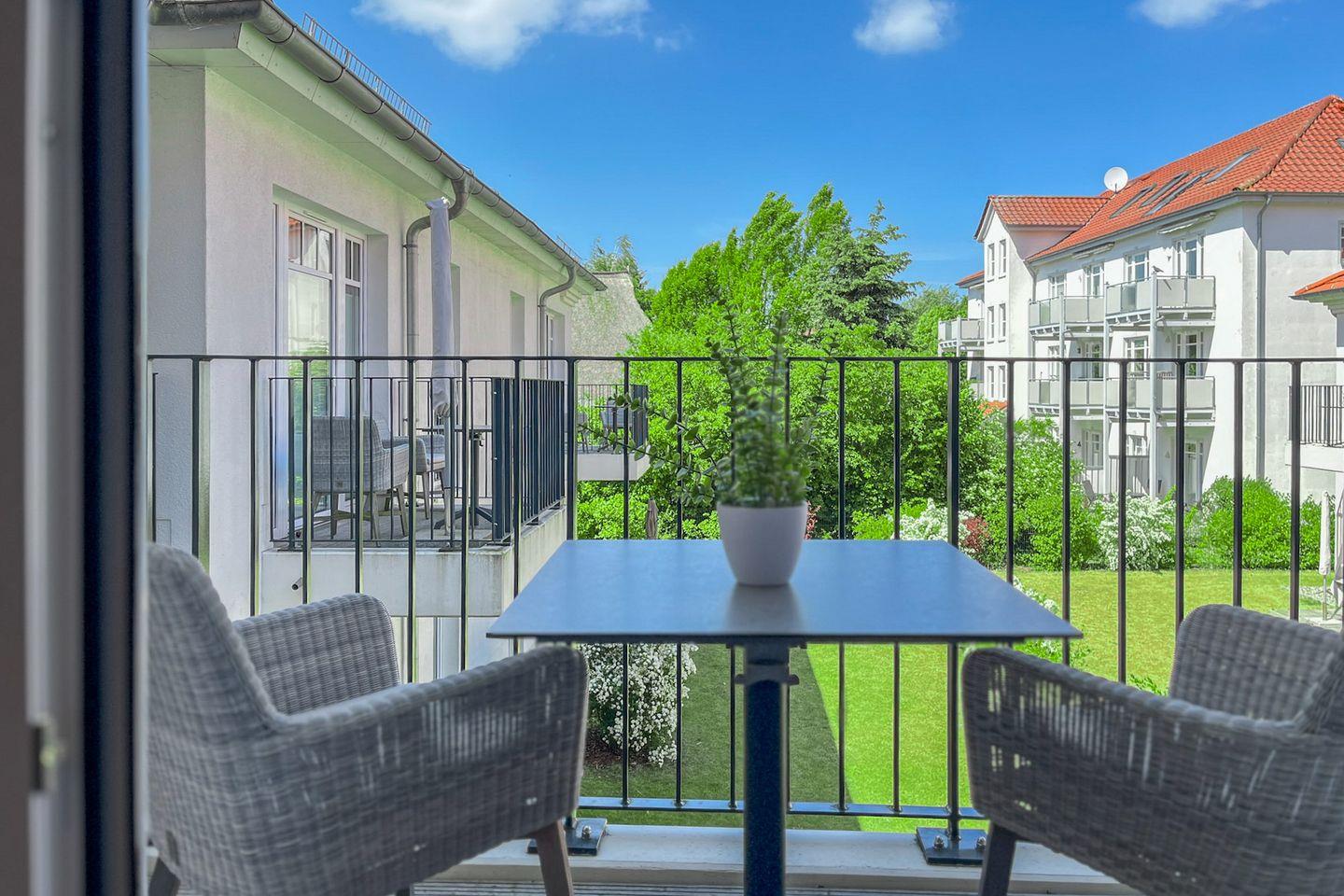Ein überdachter Balkon mit Blick ins Grüne und Gartenmöbeln lädt zum Frühstück in der Morgensonne oder zu einem Glas Wein am Abend ein.