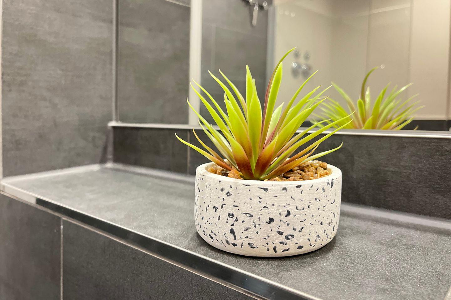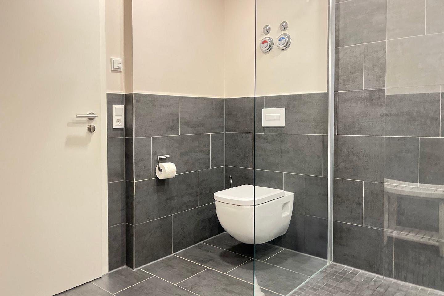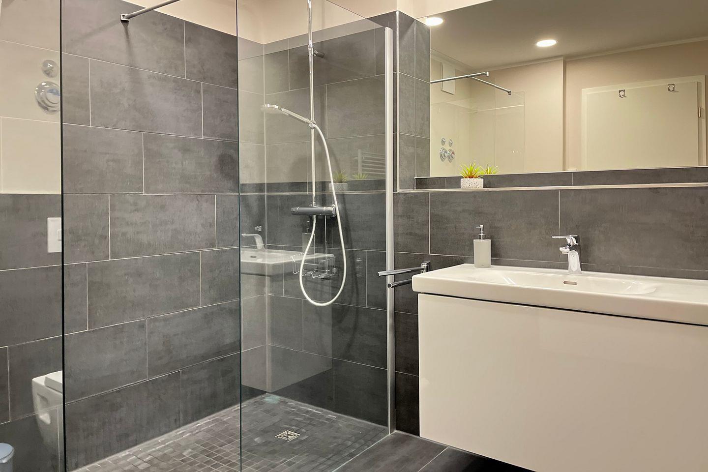 Das Badezimmer ist modern eingerichtet mit bodengleicher Dusche, WC, Waschbecken, Kosmetikspiegel und Haartrockner.