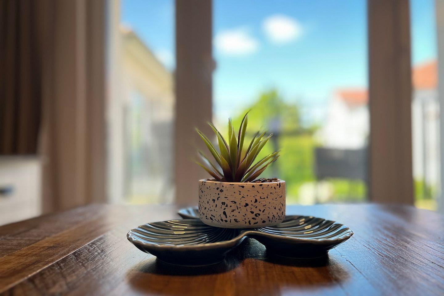 Im offen gestalteten Wohnbereich erwartet Dich eine gemütliche Sofaecke mit Flachbild-TV sowie ein Esstisch für zwei Personen. Die großen Fenster sorgen für eine angenehme Lichtstimmung und laden zum Verweilen ein.