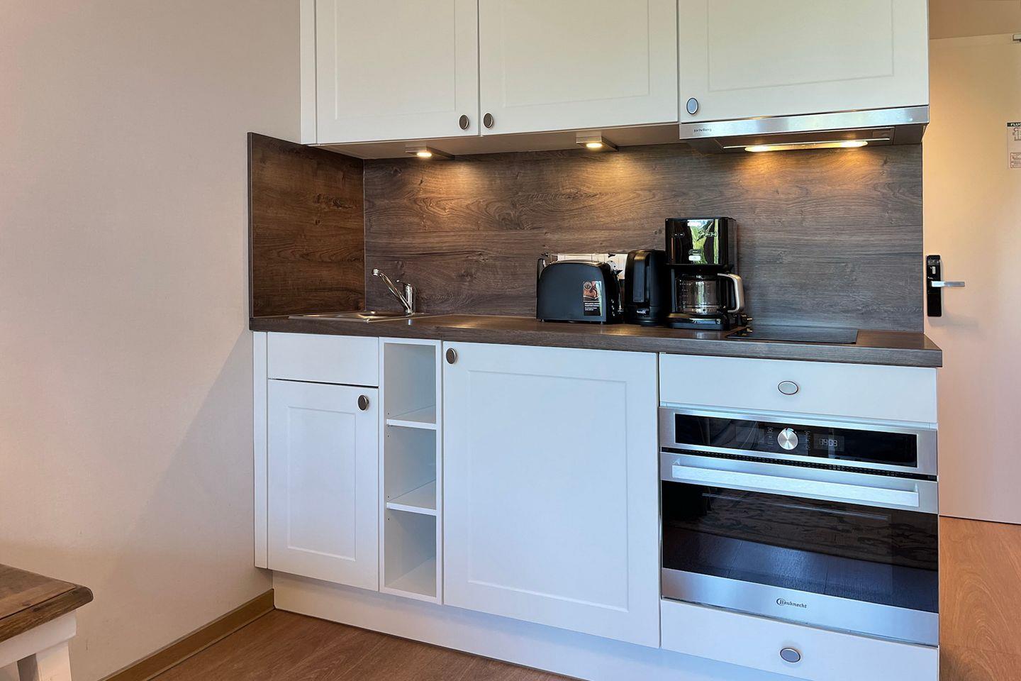 Die Küche ist offen zum Wohnraum gehalten und mit Cerankochfeld, Backofen, Kühlschrank mit Gefrierfach, Kaffeemaschine, Wasserkocher, Toaster sowie Koch- und Essgeschirr ausgestattet – ideal für kleinere Mahlzeiten im Urlaub.