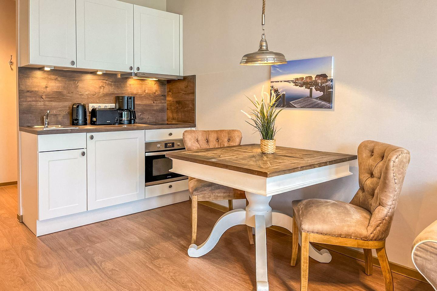 Die Küche ist offen in den Wohnraum integriert und komplett ausgestattet: Cerankochfeld, Backofen, Kühlschrank mit Gefrierfach, Kaffeemaschine, Wasserkocher, Toaster sowie alle notwendigen Küchenutensilien und Geschirr stehen Dir zur Verfügung – ideal für Deinen Urlaub mit Selbstverpflegung.