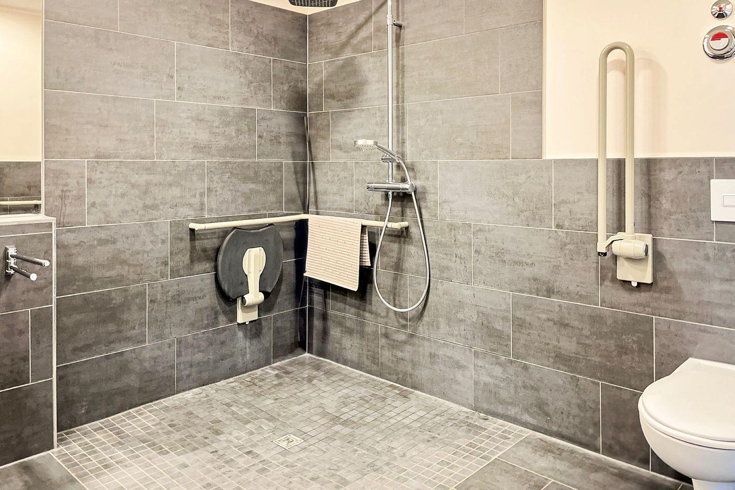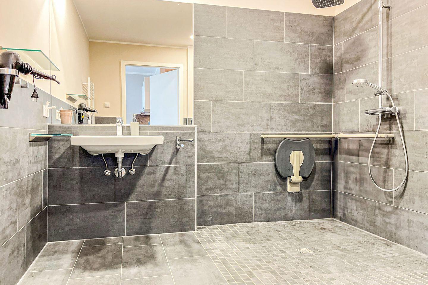 Das Badezimmer ist modern gestaltet und verfügt über eine bodengleiche Dusche sowie einen Haltegriff und Sitz, WC, Waschbecken, Kosmetikspiegel und Haartrockner – für einen angenehmen Start in den Tag.