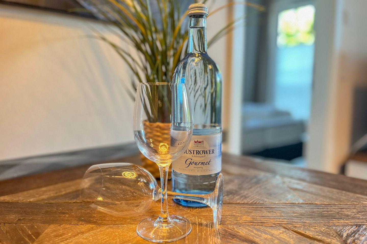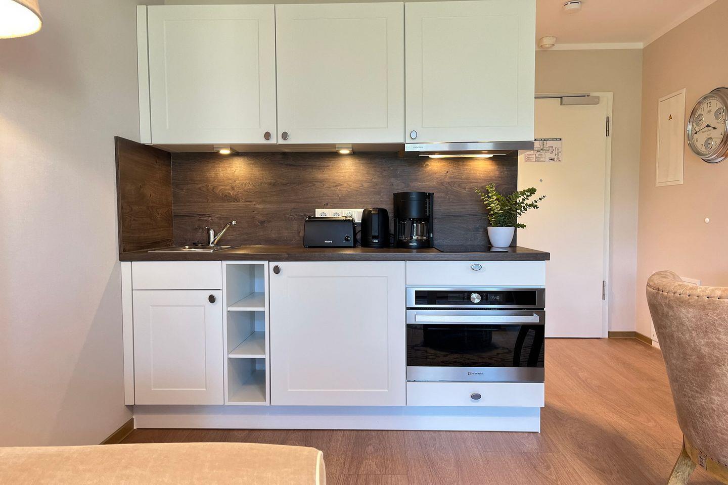 Die moderne Küchenzeile ist offen in den Wohnraum integriert und mit allem ausgestattet, was Du für Deinen Aufenthalt benötigst: Cerankochfeld, Backofen mit Mikrowellenfunktion, Kühlschrank mit Gefrierfach, Kaffeemaschine, Wasserkocher, Toaster sowie Kochutensilien und Geschirr.