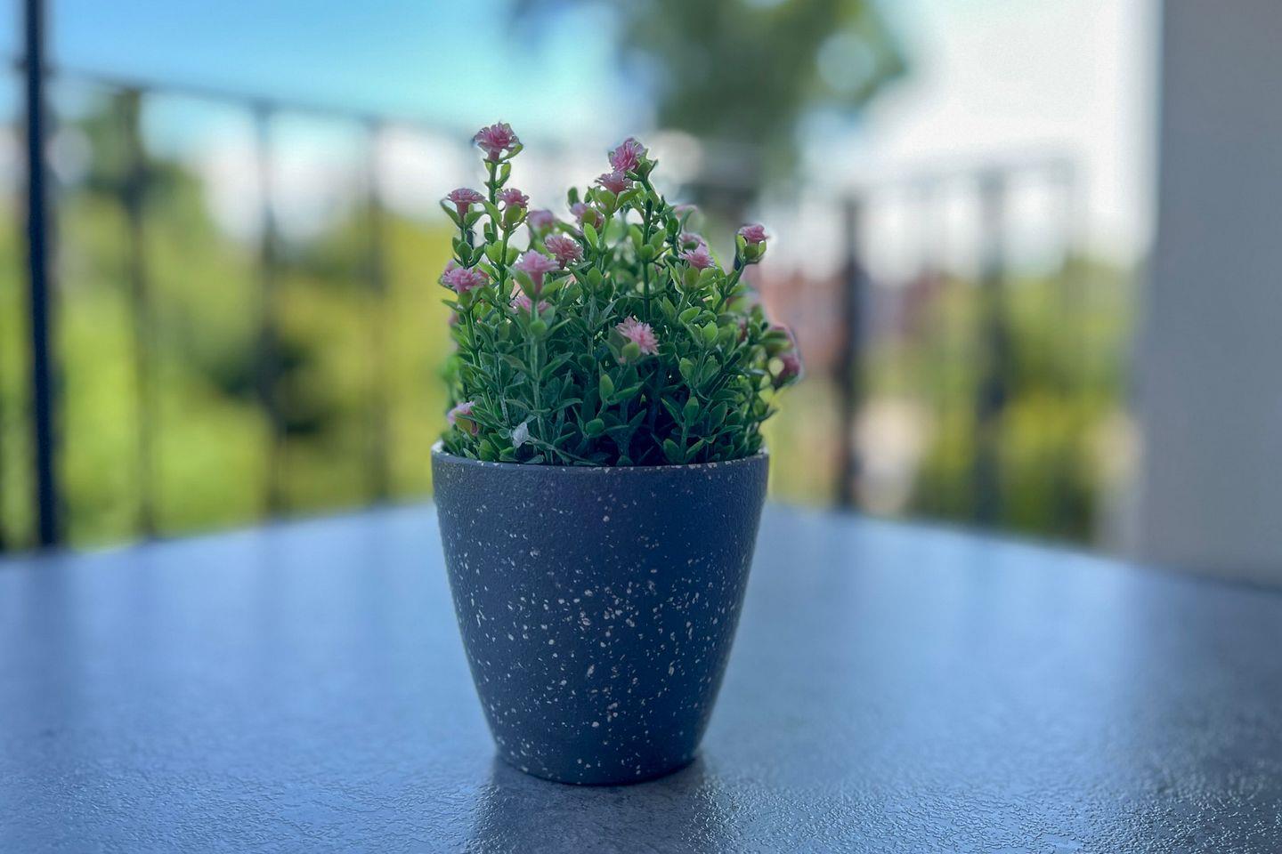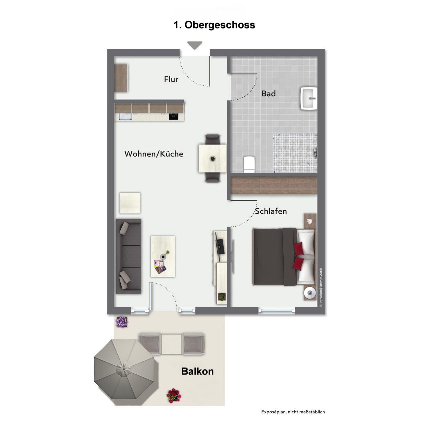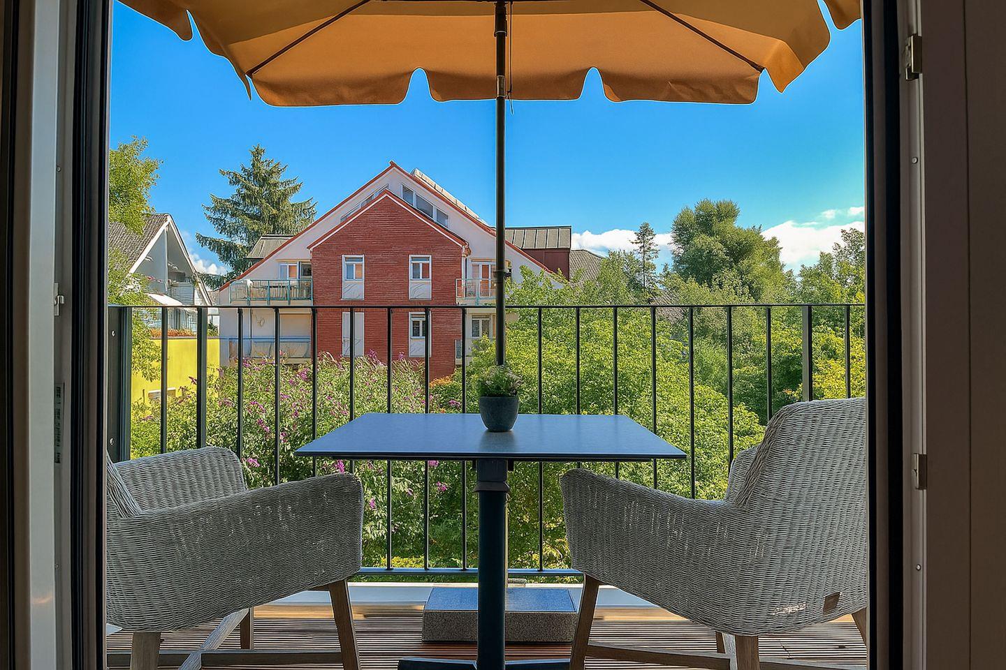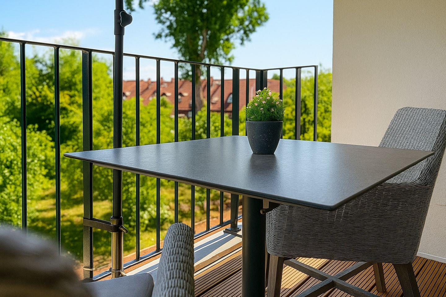 Ein möblierter Balkon mit Sonnenschirm lädt zu entspannten Momenten im Freien ein – sei es bei einer Tasse Kaffee oder bei einem Glas Wein.