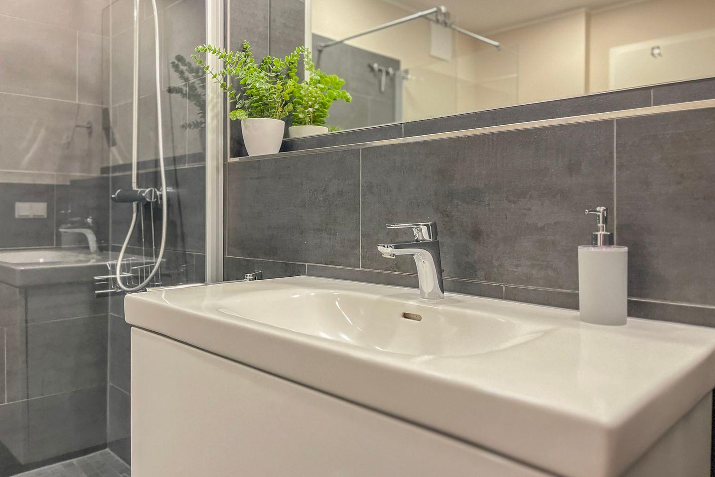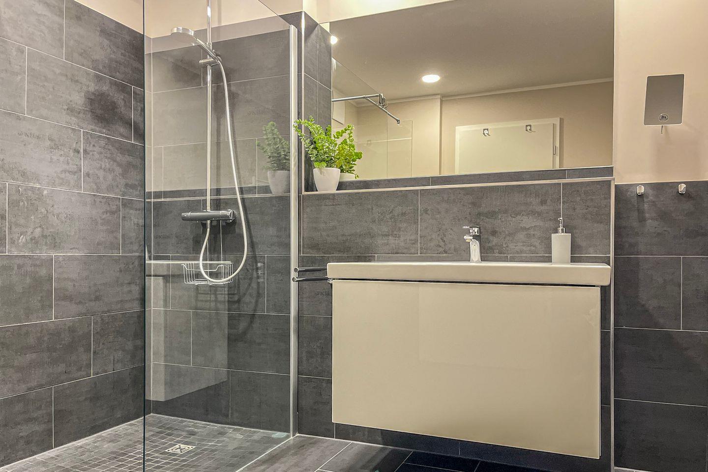 Das Badezimmer ist modern und funktional mit bodengleicher Dusche, WC, Waschbecken, Kosmetikspiegel und Haartrockner ausgestattet.