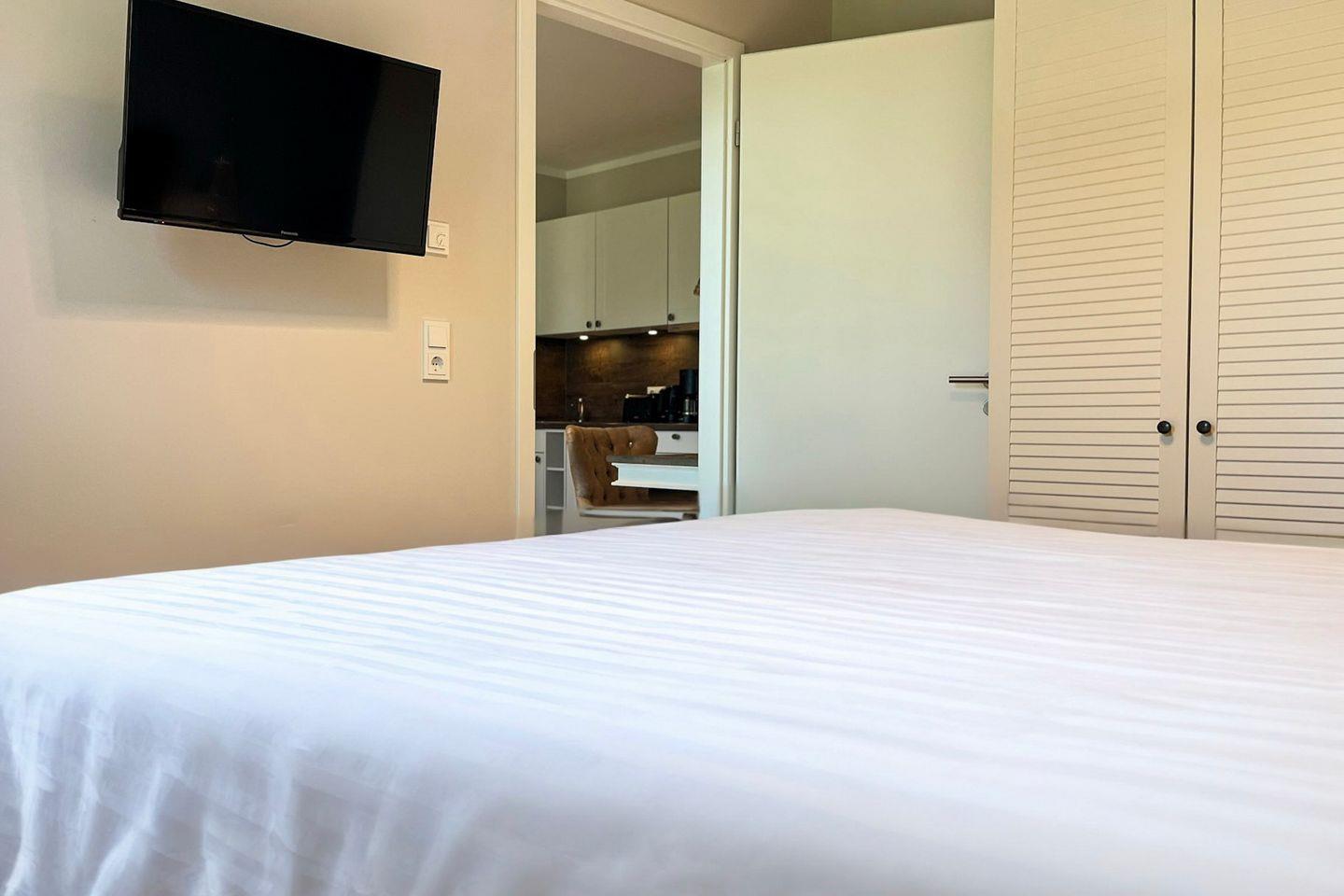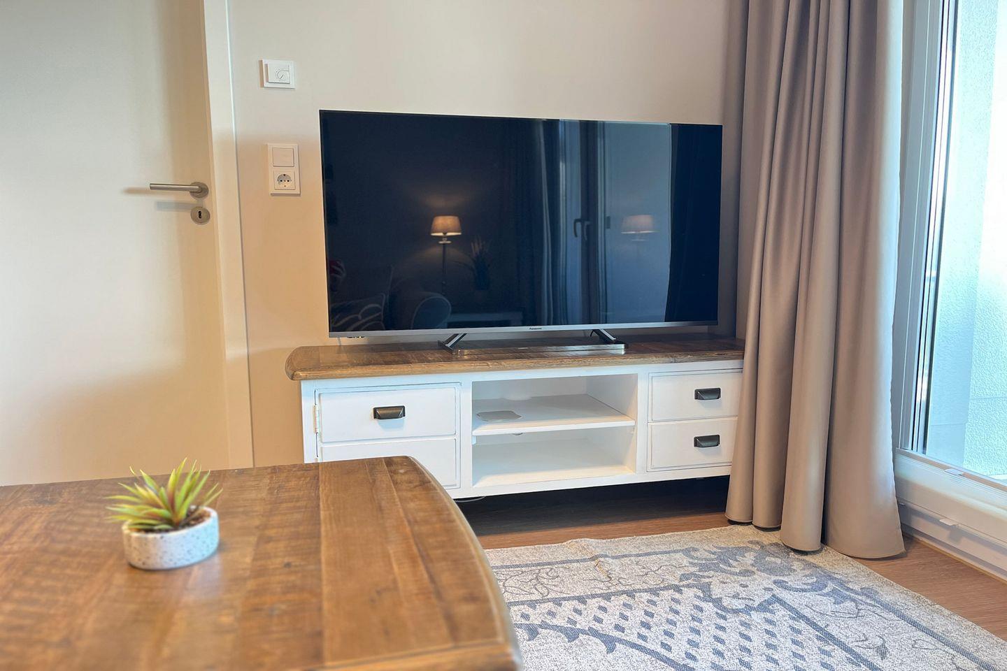 Im offenen Wohnbereich erwarten Dich ein bequemes Sofa, ein Flachbild-TV für gemütliche Stunden sowie ein Essplatz für zwei Personen. Große Fenster sorgen für eine helle, angenehme Atmosphäre.