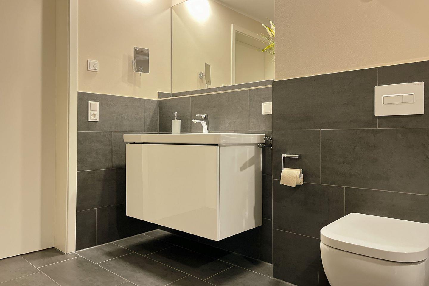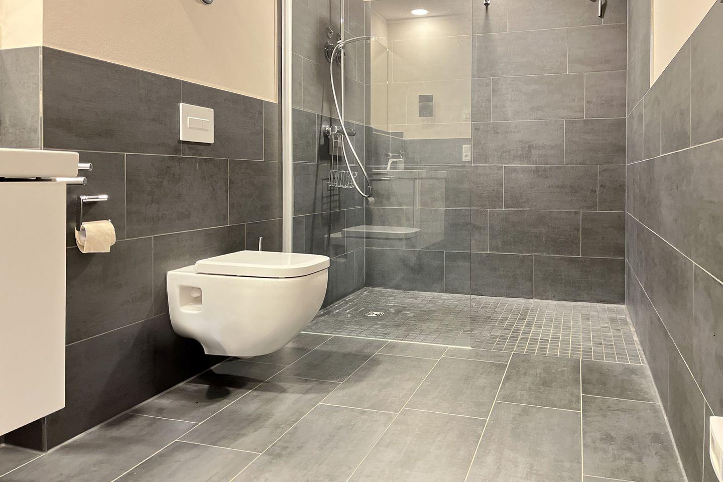 Das Badezimmer ist funktional und hochwertig ausgestattet mit bodengleicher Dusche, WC, Waschbecken, Kosmetikspiegel und Haartrockner.