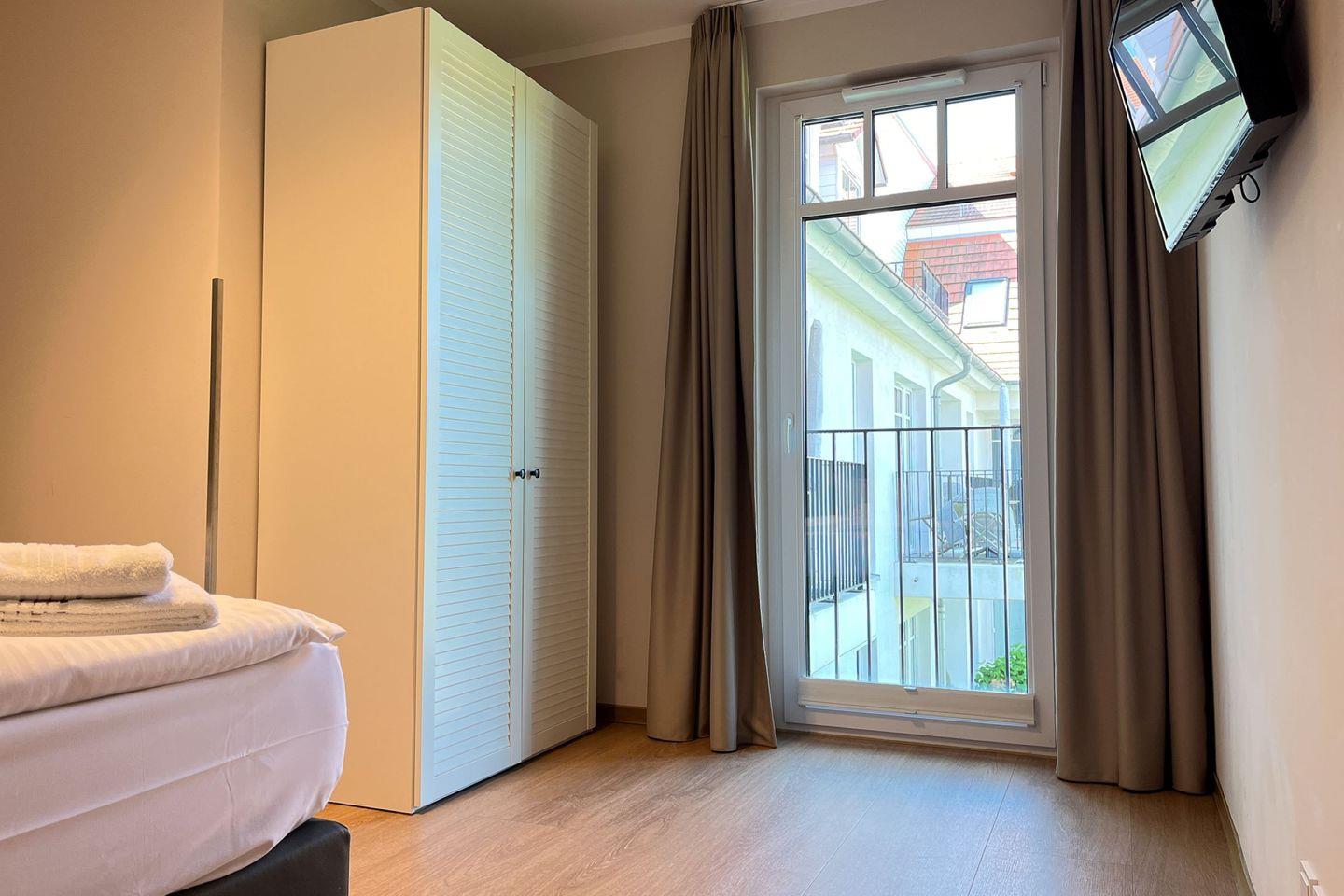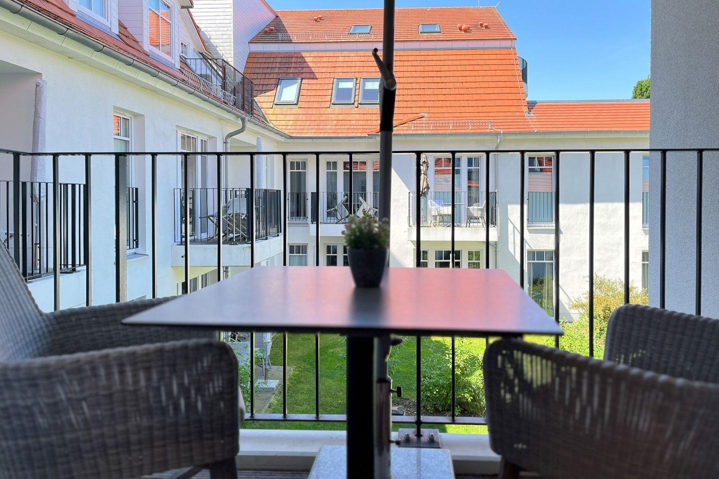 Die Ferienwohnung Nr. 38 in der strandnahen Anlage Baltischer Hof ist eine 2-Zimmer-Wohnung für bis zu 2 Personen und liegt im 1. Obergeschoss. Sie verfügt über ein Wohnzimmer mit integrierter Küchenzeile, ein Bad mit Dusche, ein Schlafzimmer und einen Balkon.