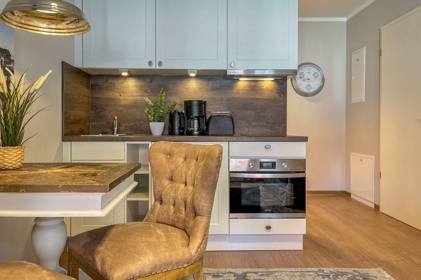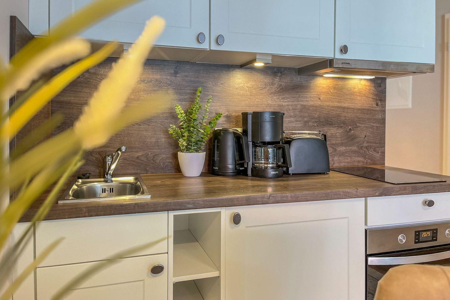 Die moderne Küchenzeile ist offen in den Wohnraum integriert und verfügt über Cerankochfeld, Backofen, Kühlschrank mit Gefrierfach, Kaffeemaschine, Wasserkocher, Toaster sowie Geschirr und Kochutensilien für die Selbstverpflegung.