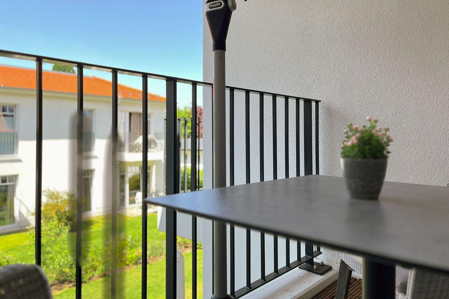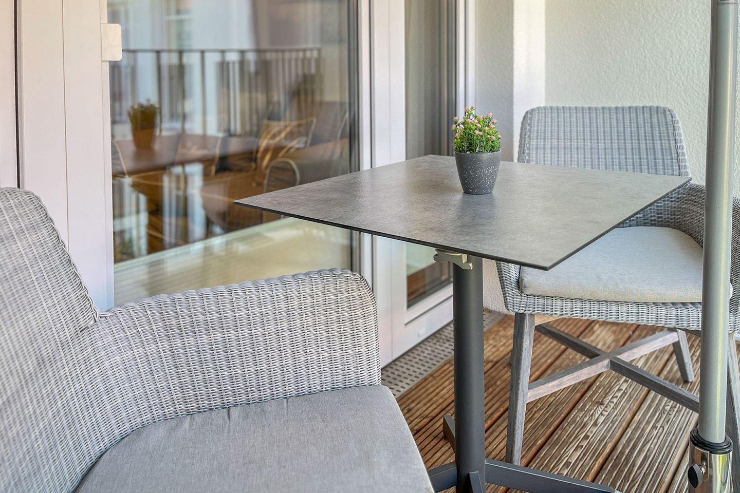 Ein weiteres Plus ist der Balkon mit Gartenmöbeln und Sonnenschirm – ein herrlicher Ort für das Frühstück im Freien oder ein Glas Wein am Abend.