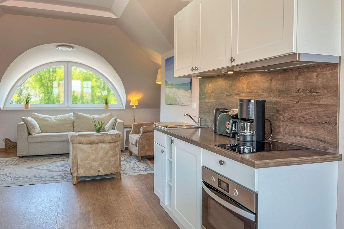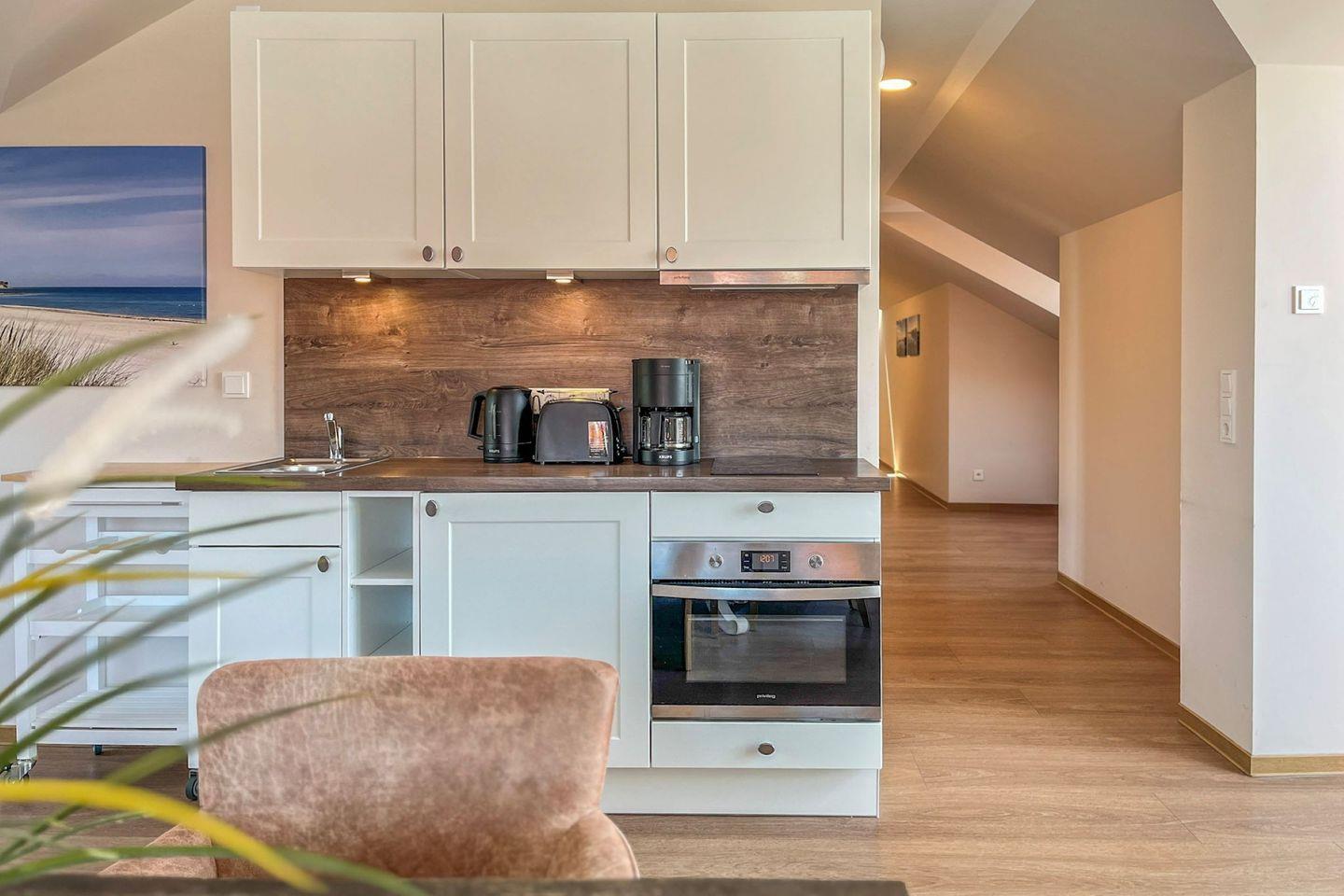 Die offene Küche ist hochwertig ausgestattet: Cerankochfeld, Backofen, extra Gefrierschrank, Kaffeemaschine, Wasserkocher, Toaster, umfangreiche Kochutensilien sowie Geschirr und Besteck – alles da für eine entspannte Selbstverpflegung.