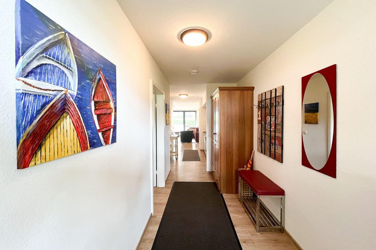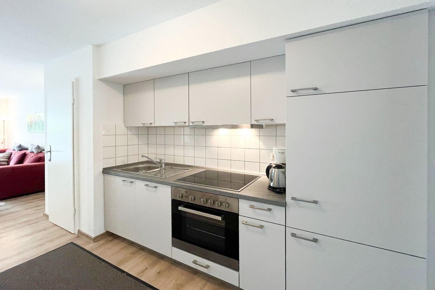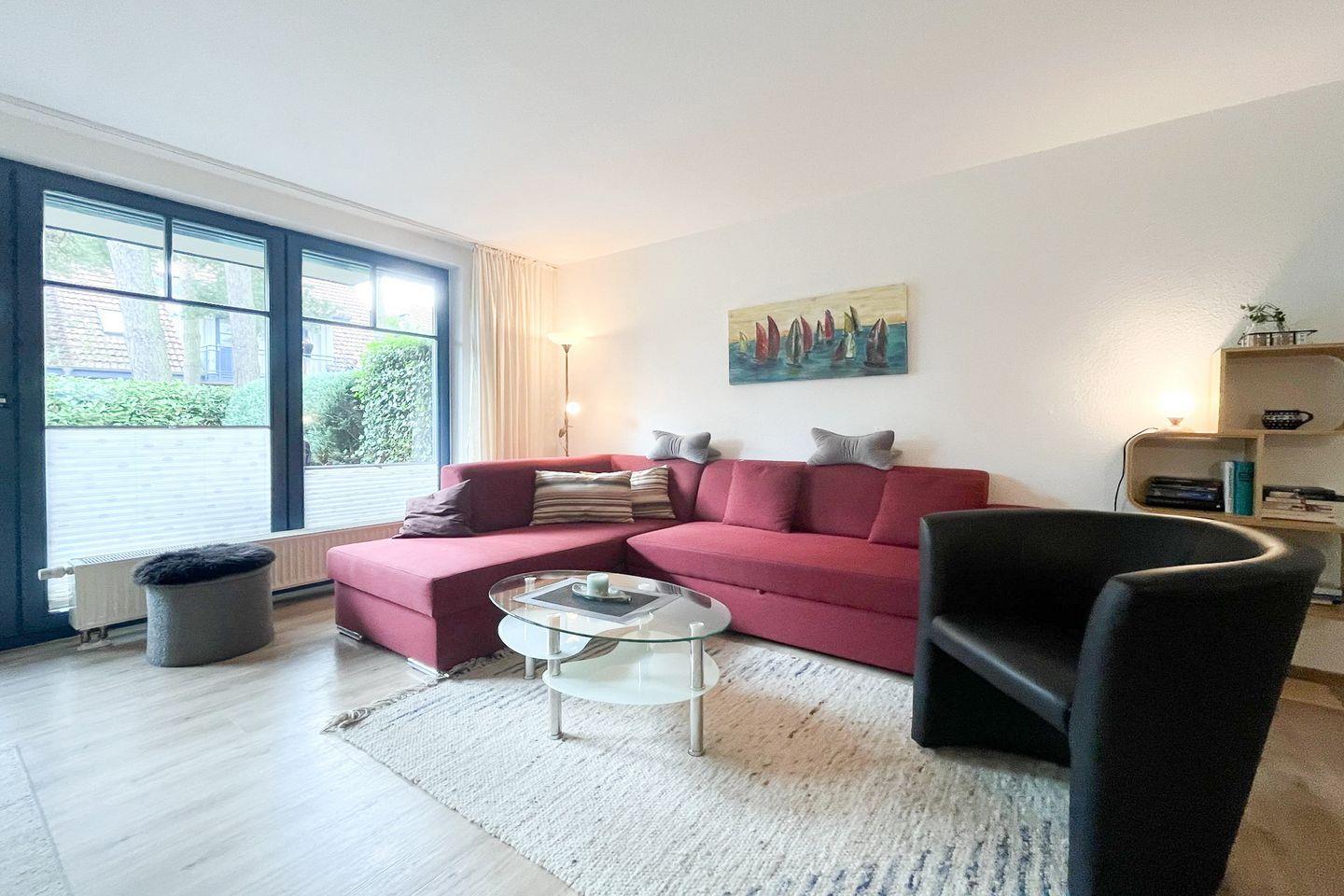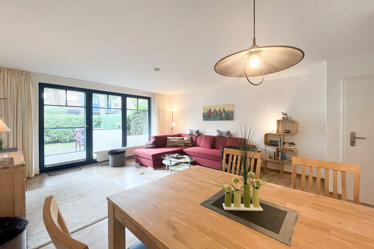 Mit einer Wohnfläche von 55 m² bietet die Wohnung Platz für bis zu vier Personen und eignet sich somit besonders für Paare oder Familien. Der offene Grundriss verbindet das Wohnzimmer mit einem einladenden Essbereich, sodass gemeinsames Kochen und gemütliche Abende unkompliziert möglich sind. Eine komfortable Sofaecke mit Sessel und TV (Kabelanschluss, CD-Spieler und Radio vorhanden) lädt nach einem Tag am Meer zum Ausspannen ein. Der Vinylboden im Wohn- und Schlafzimmer sorgt nicht nur für eine harmonische Optik, sondern auch für eine leichte Reinigung.