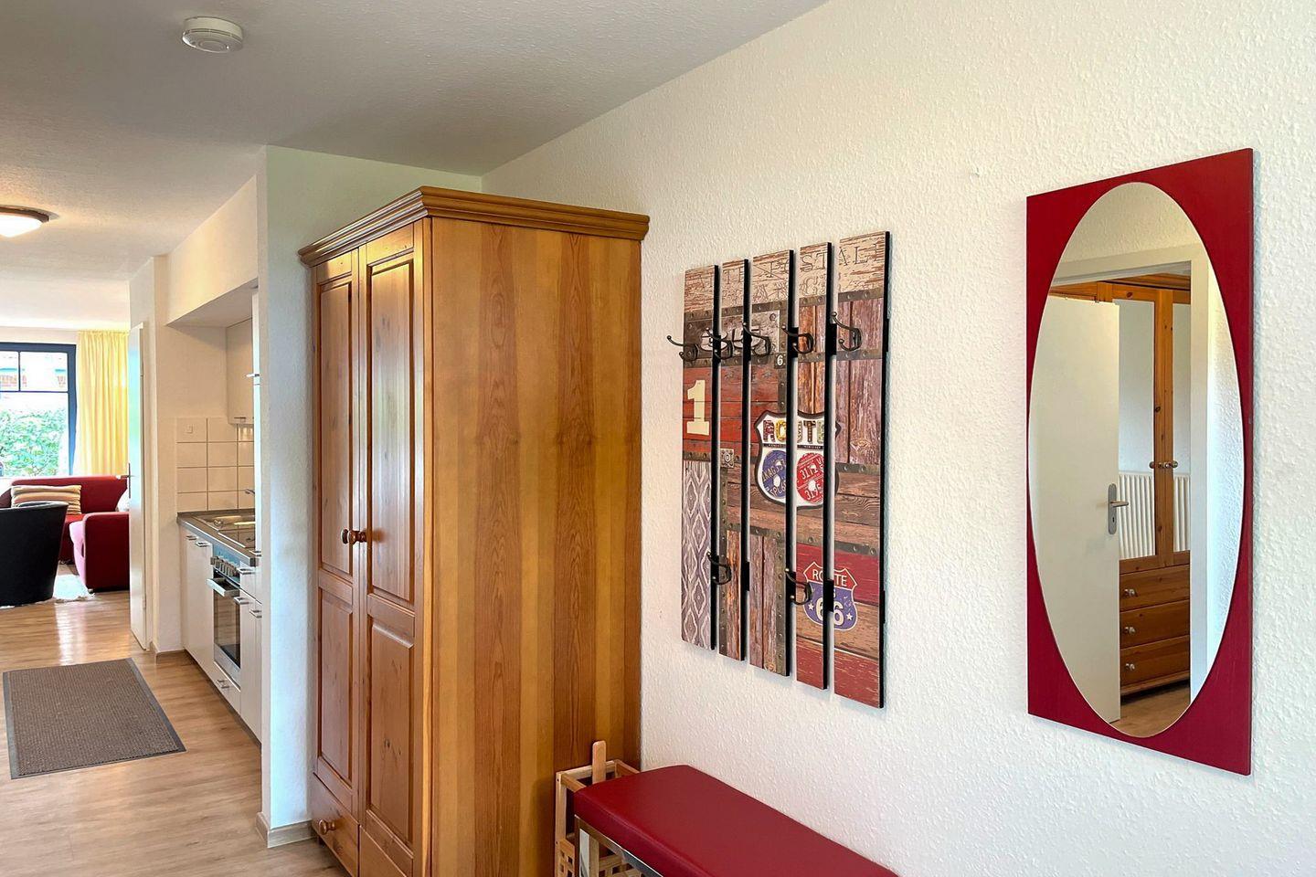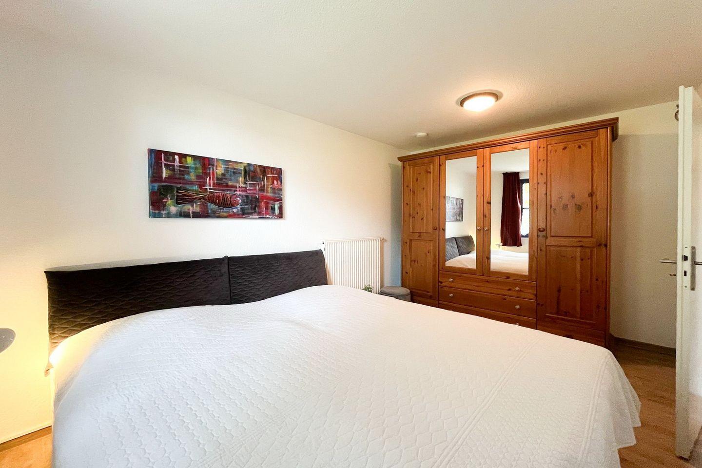Das separate Schlafzimmer verfügt über ein komfortables Doppelbett und ausreichend Stauraum. Für weitere Schlafmöglichkeiten steht im Wohnbereich ein Schlafsofa bereit, sodass die Wohnung problemlos von bis zu vier Gästen genutzt werden kann. Familien profitieren von der kinderfreundlichen Ausstattung – ein Babybett und ein Hochstuhl sind ebenso vorhanden wie der Zugang zu einem Spielplatz im Feriendorf.
