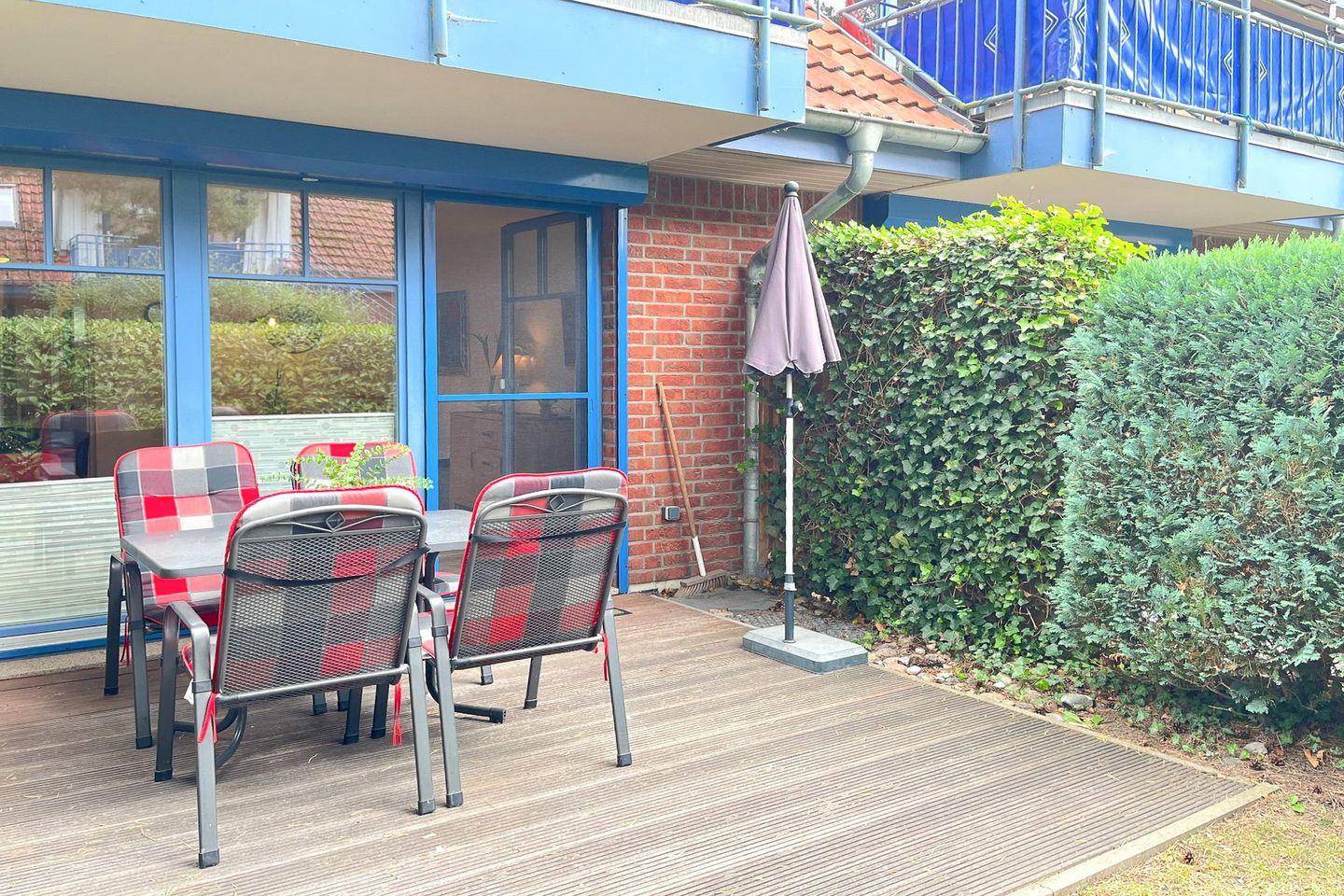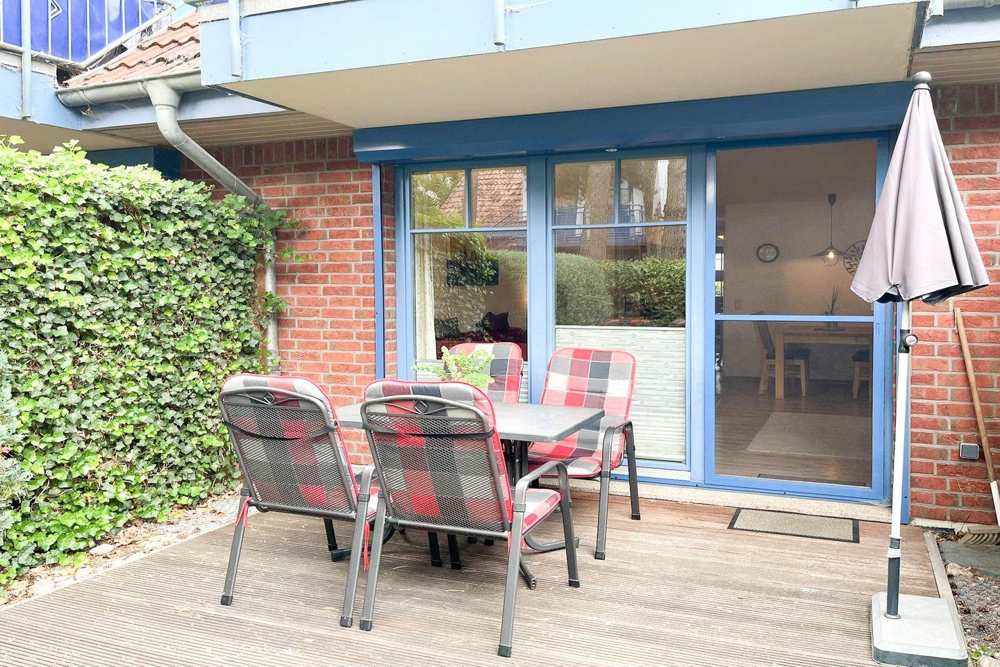 Die private Terrasse bietet Dir die Möglichkeit, im Freien zu entspannen. Gartenmöbel und ein Sonnenschirm laden zum Frühstück im Freien oder zu geselligen Stunden ein. Ein eigener Pkw-Stellplatz ist direkt an der Unterkunft für Dich reserviert. Die Wohnung ist vollständig rauchfrei und mit Rauchmeldern ausgestattet.
