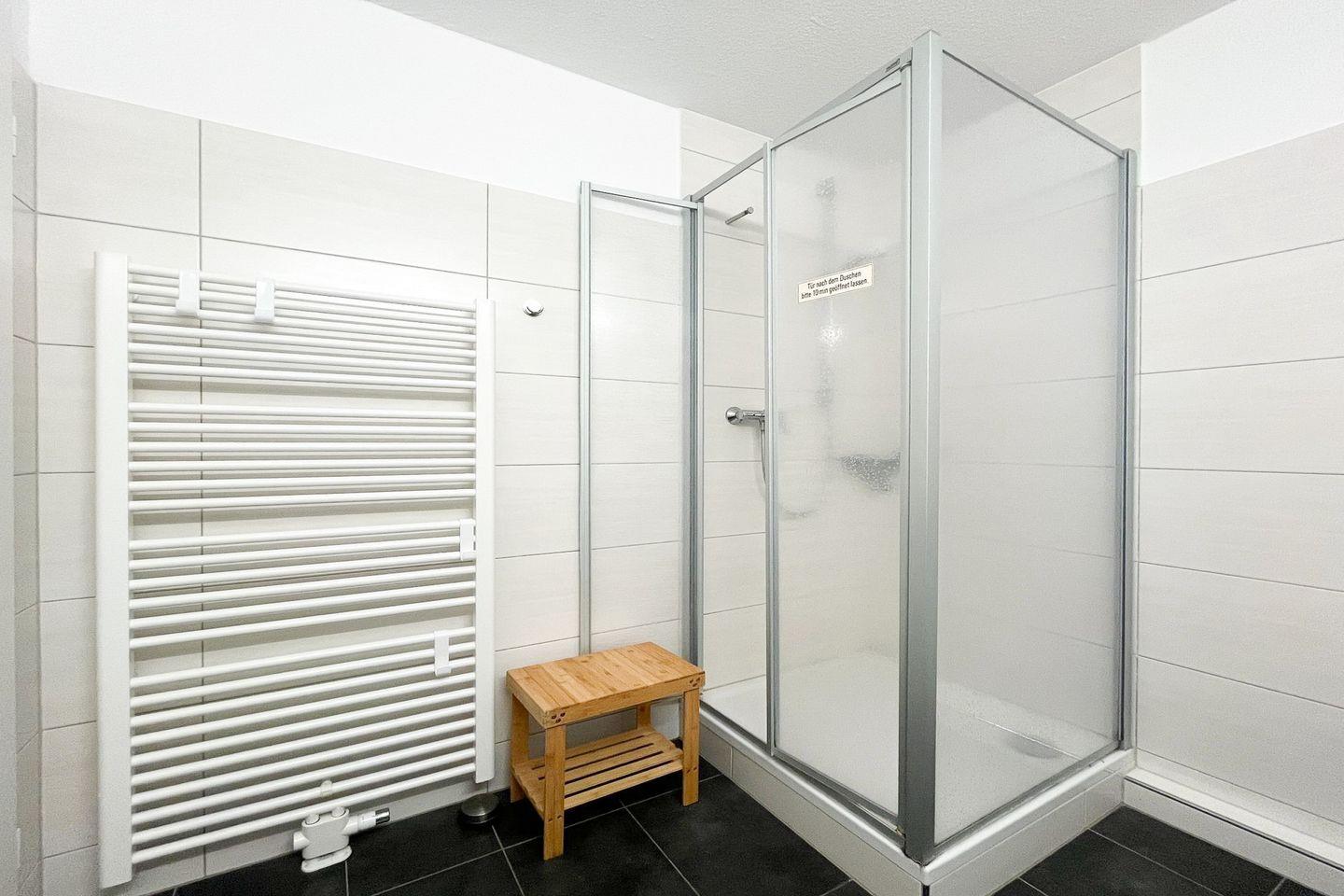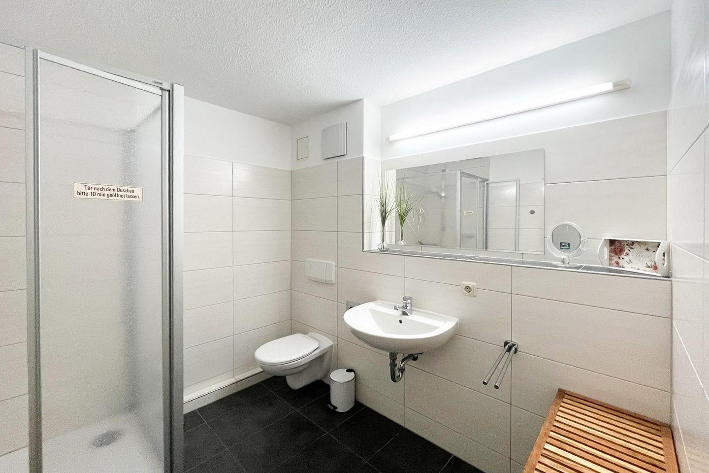 Im Badezimmer findest du eine Dusche, ein WC, ein Waschbecken mit Spiegel und einen Haartrockner vor. Münzwaschmaschine und Münztrockner können gemeinschaftlich (Keller) genutzt werden und erleichtern längere Aufenthalte ebenso wie der Wäscheständer und der Staubsauger, die zur Ausstattung gehören.