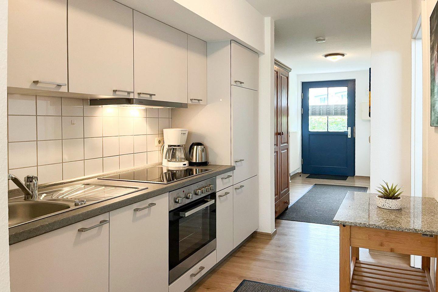 Die offen zum Wohnzimmer gestaltete Küche ist voll ausgestattet: Dir stehen ein 4-Platten-Ceranherd, Backofen, Kühlschrank mit Gefrierfach, Spülmaschine, Mikrowelle, Wasserkocher, Toaster sowie eine Kaffeemaschine und vielfältige Küchenutensilien und Besteck zur Verfügung. Der angrenzende Essbereich mit Esstisch ergänzt das stimmige Raumangebot.