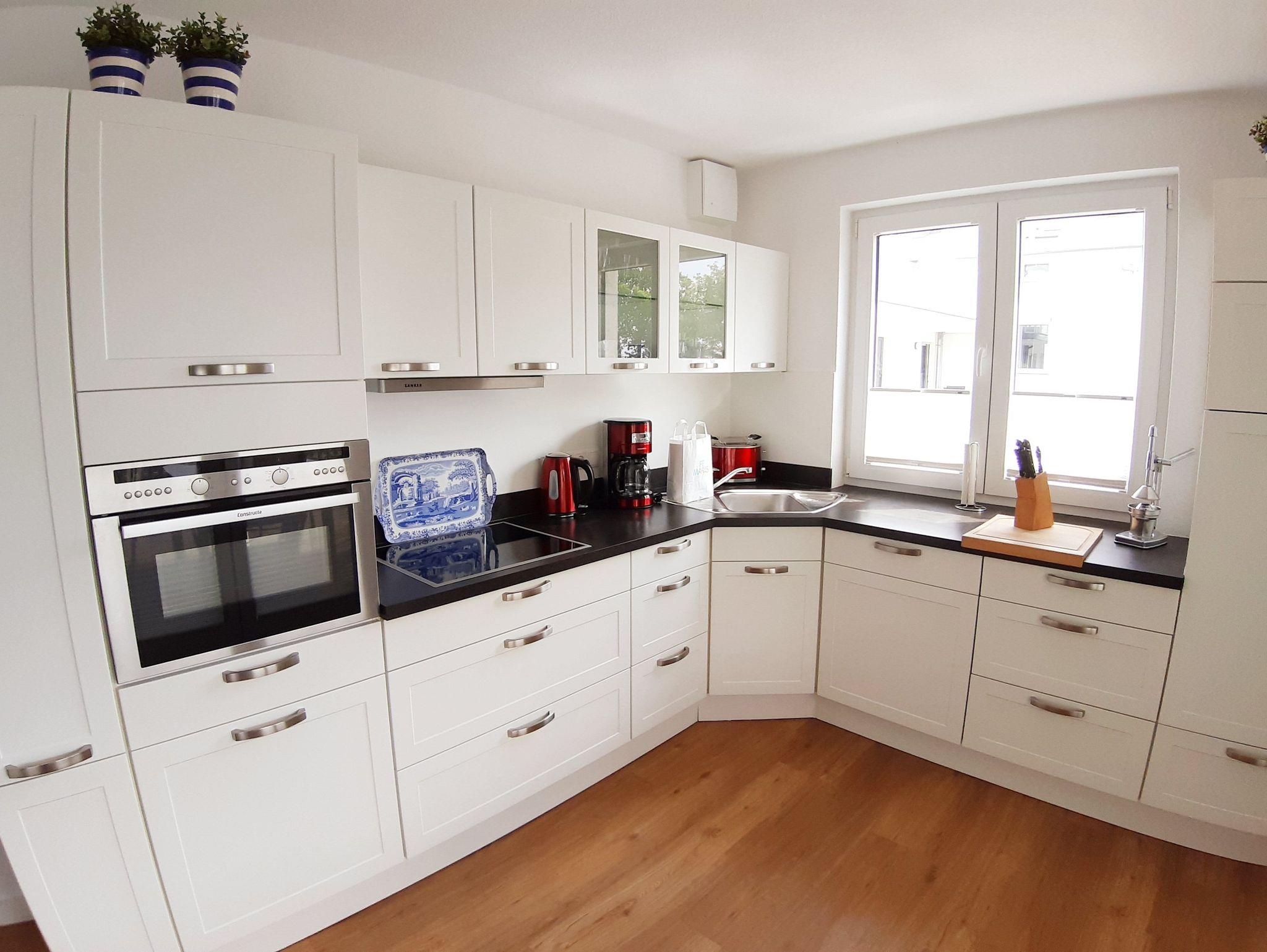 Die Küche ist exklusiv ausgestattet mit allen dazu gehörenden technischen Geräten wie Spülmaschine, Kühlschrank mit Gefrierfach und hoch eingebautem Backofen.