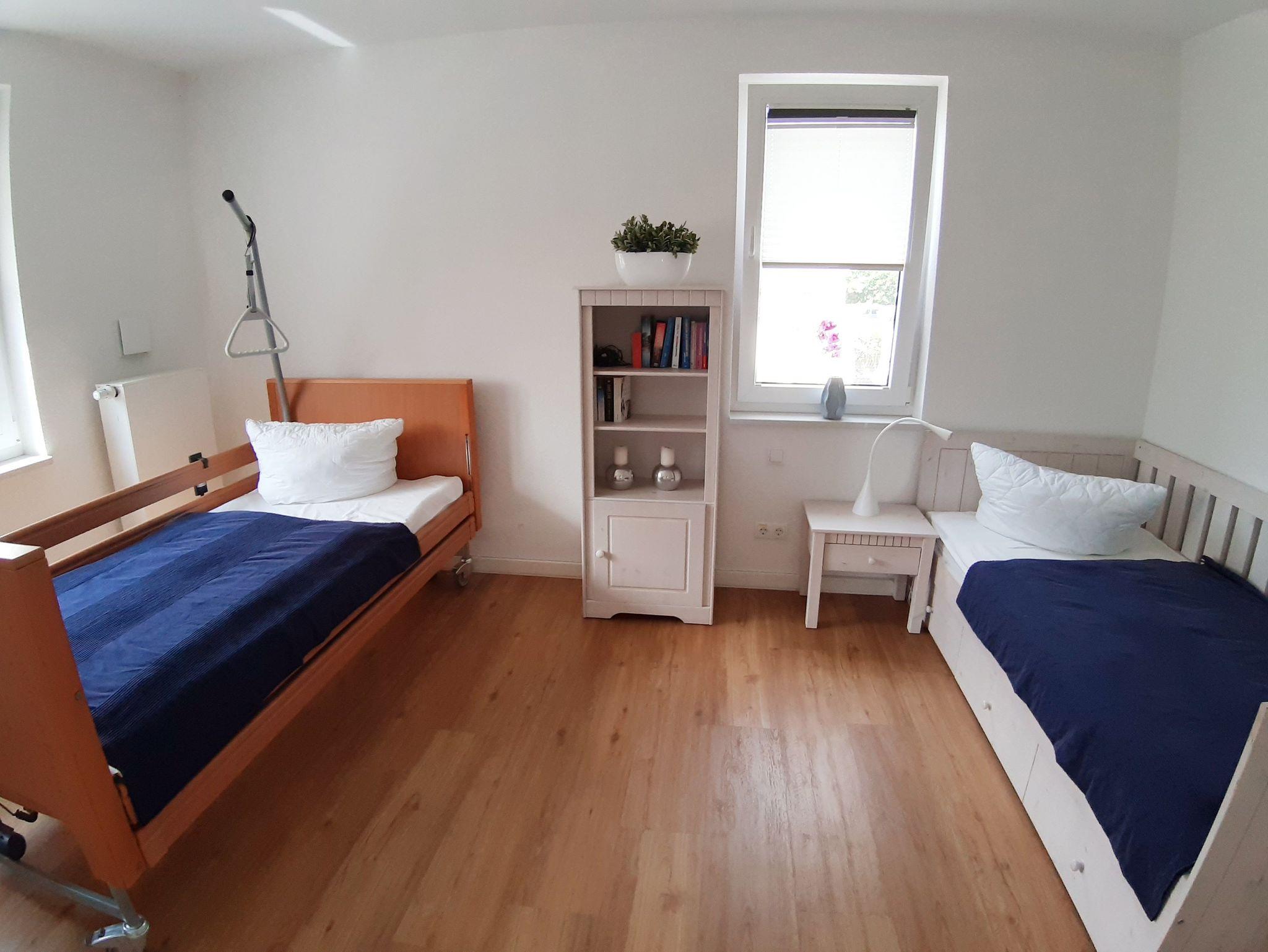 Schlafzimmer mit Einzelbett und Pflege- bzw. Krankenbett mit Patientenlifter