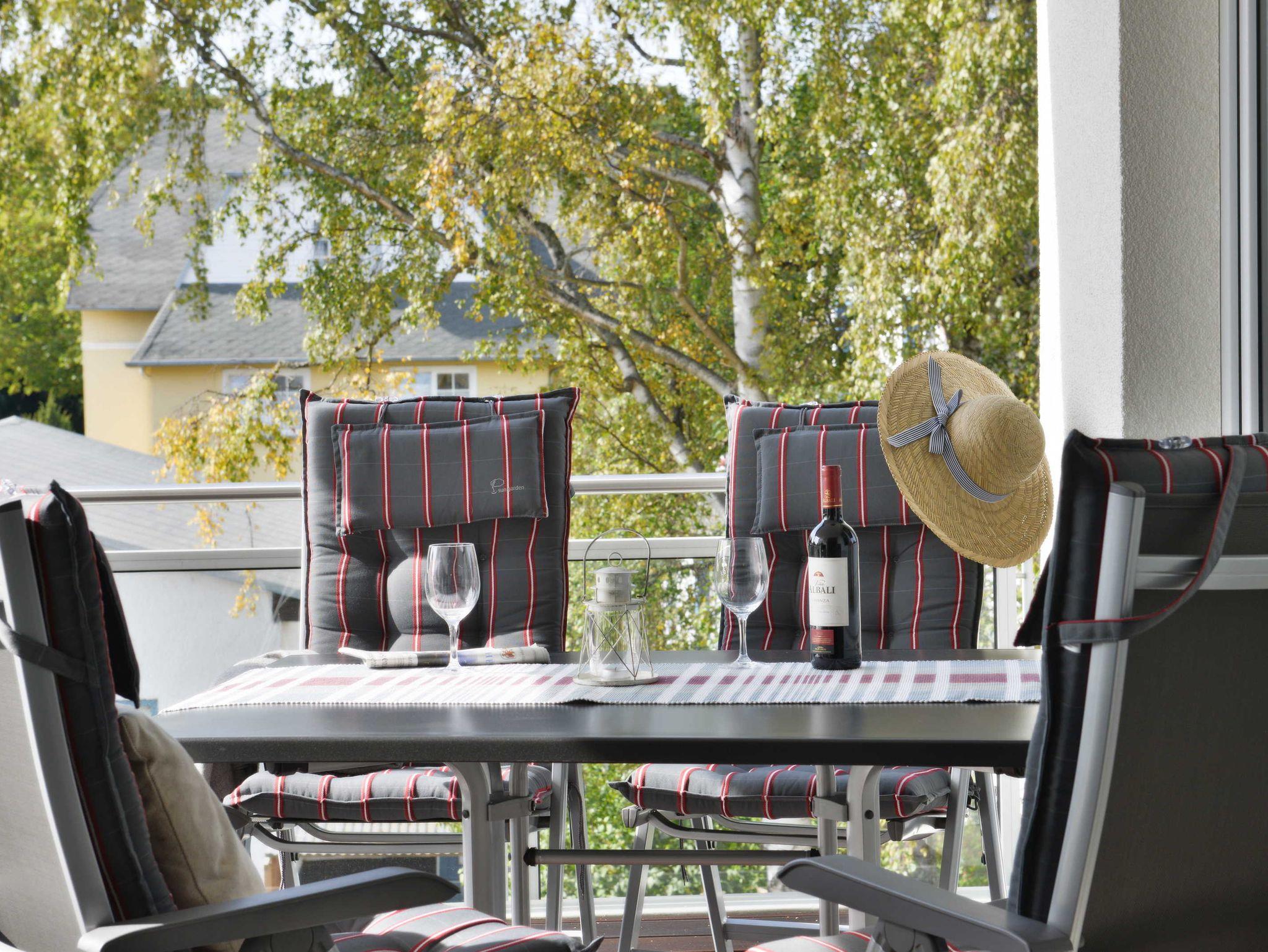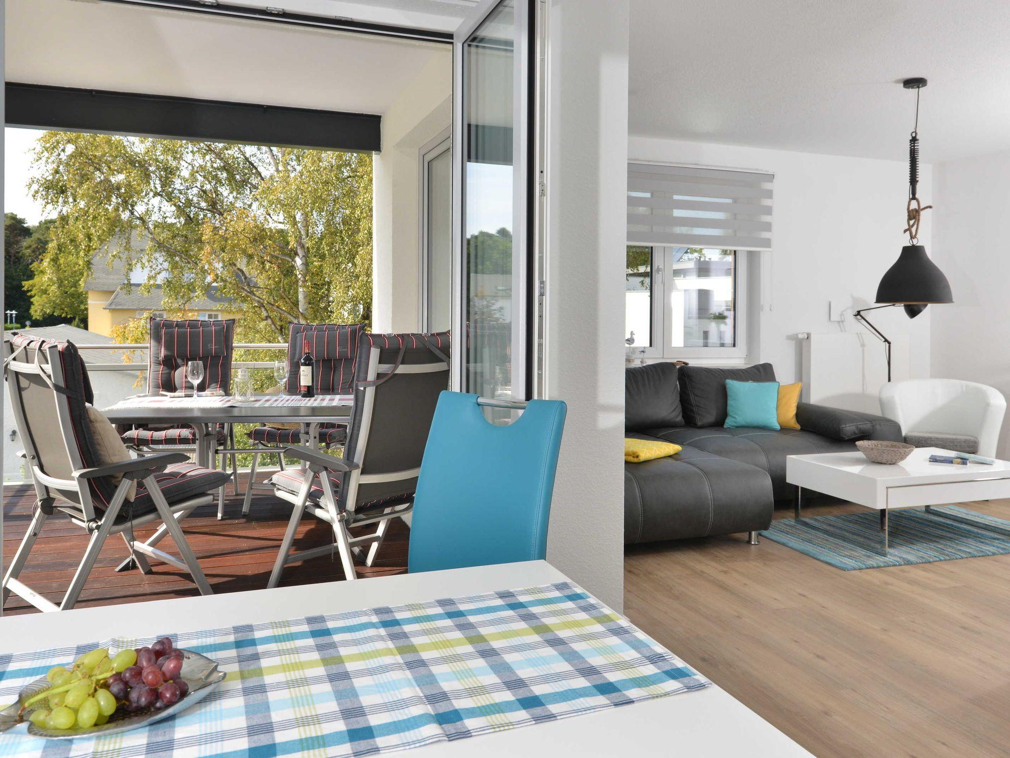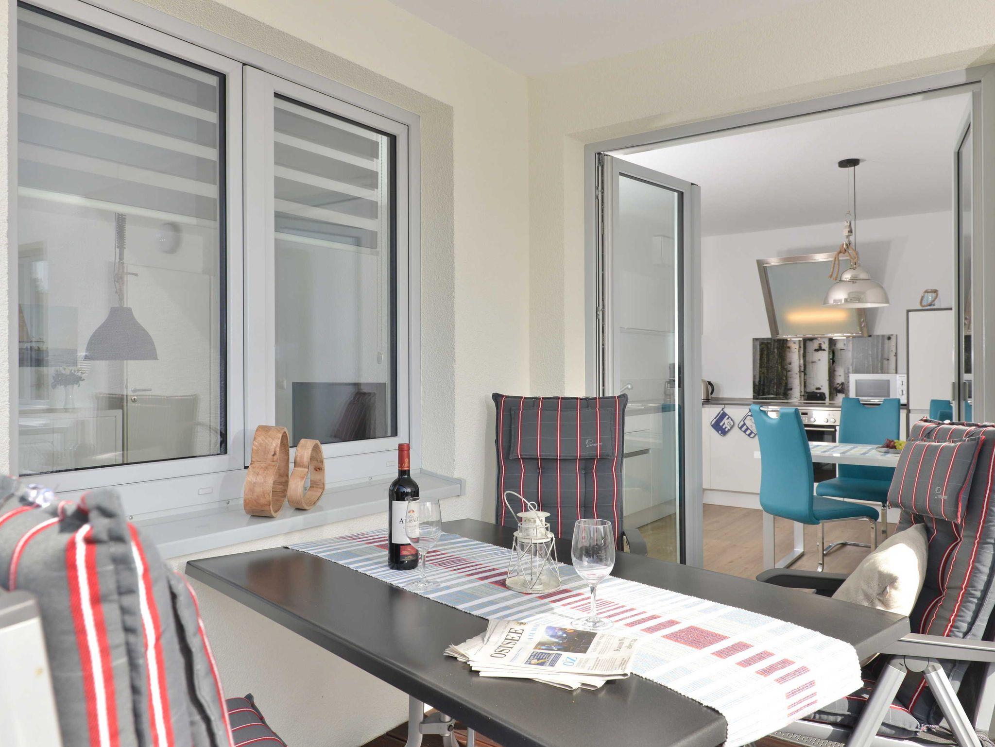 Auf dem großzügigen Balkon sitzen Sie geschützt vor Wind und Wetter auf der vom Meer abgewandten Seite und trotzdem in Hörweite des Wellenrauschens.