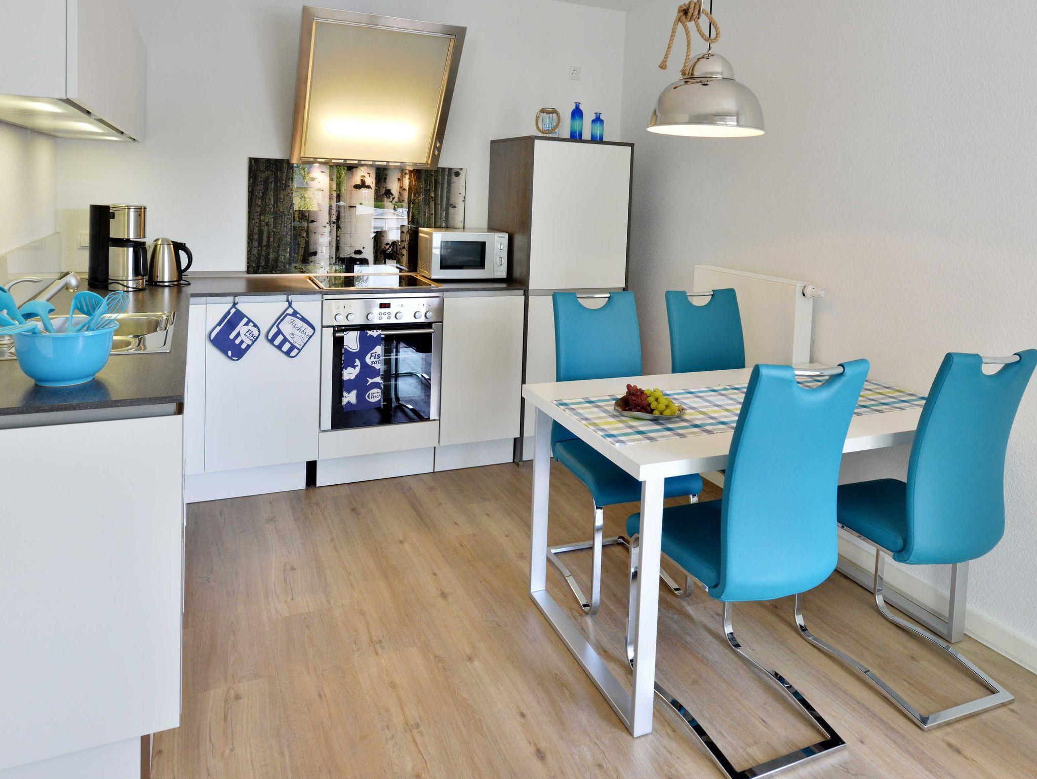 Küche mit Spülmaschine, Backofen, Kaffeemaschine, Mikrowelle, Kühlschrank mit 0-Grad Zone