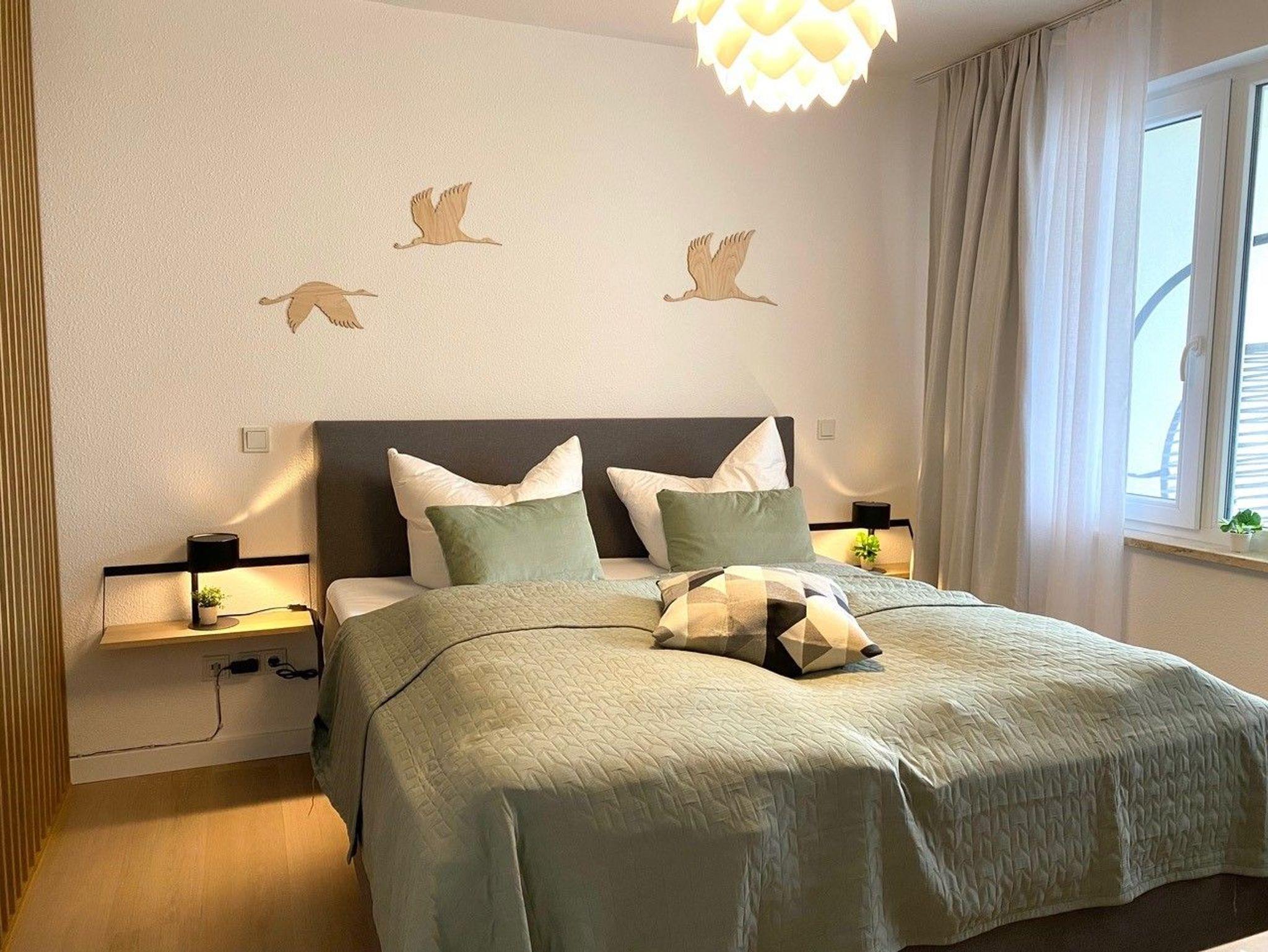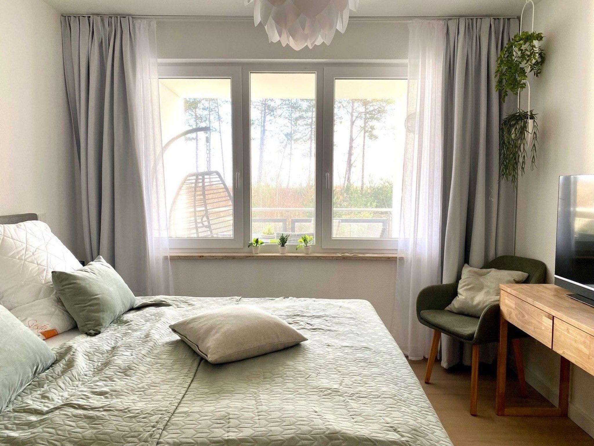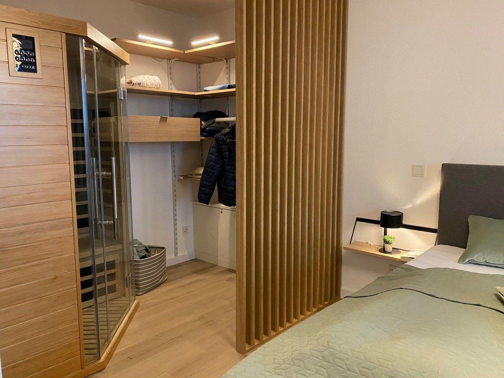 Die Wohnung ist hoch- und neuwertig eingerichtet und vorallem nachhaltig eingerichtet. Das Schlafzimmer mit Echtholzmöbeln beherbergt ein großes Doppelbett, einen begehbaren Kleiderschrank und eine Infrarotkabine. In den großzügigen Wohnbereich ist eine moderne, vollausgestattete Küche integriert, außerdem finden Sie einen Essbereich sowie eine behagliche Couchecke mit großem TV-Gerät.