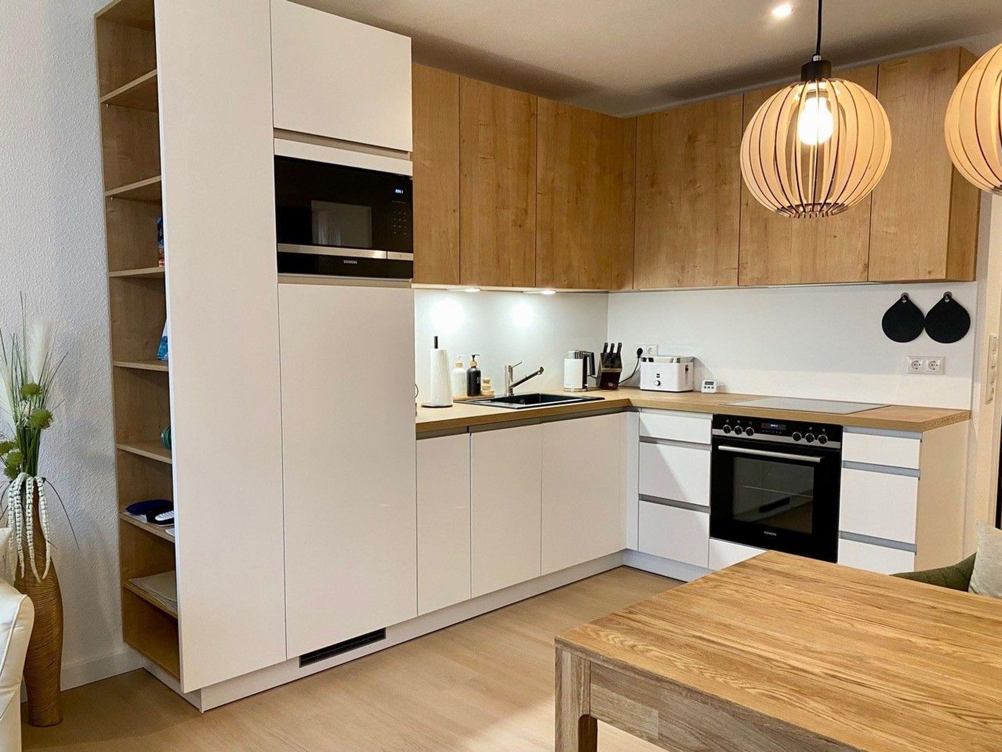 vollausgestattete Küche mit Spülmaschine, Herd & Backofen, Kaffee-Kombi-Maschine (Pad und Filter), Toaster, Wasserkocher usw.