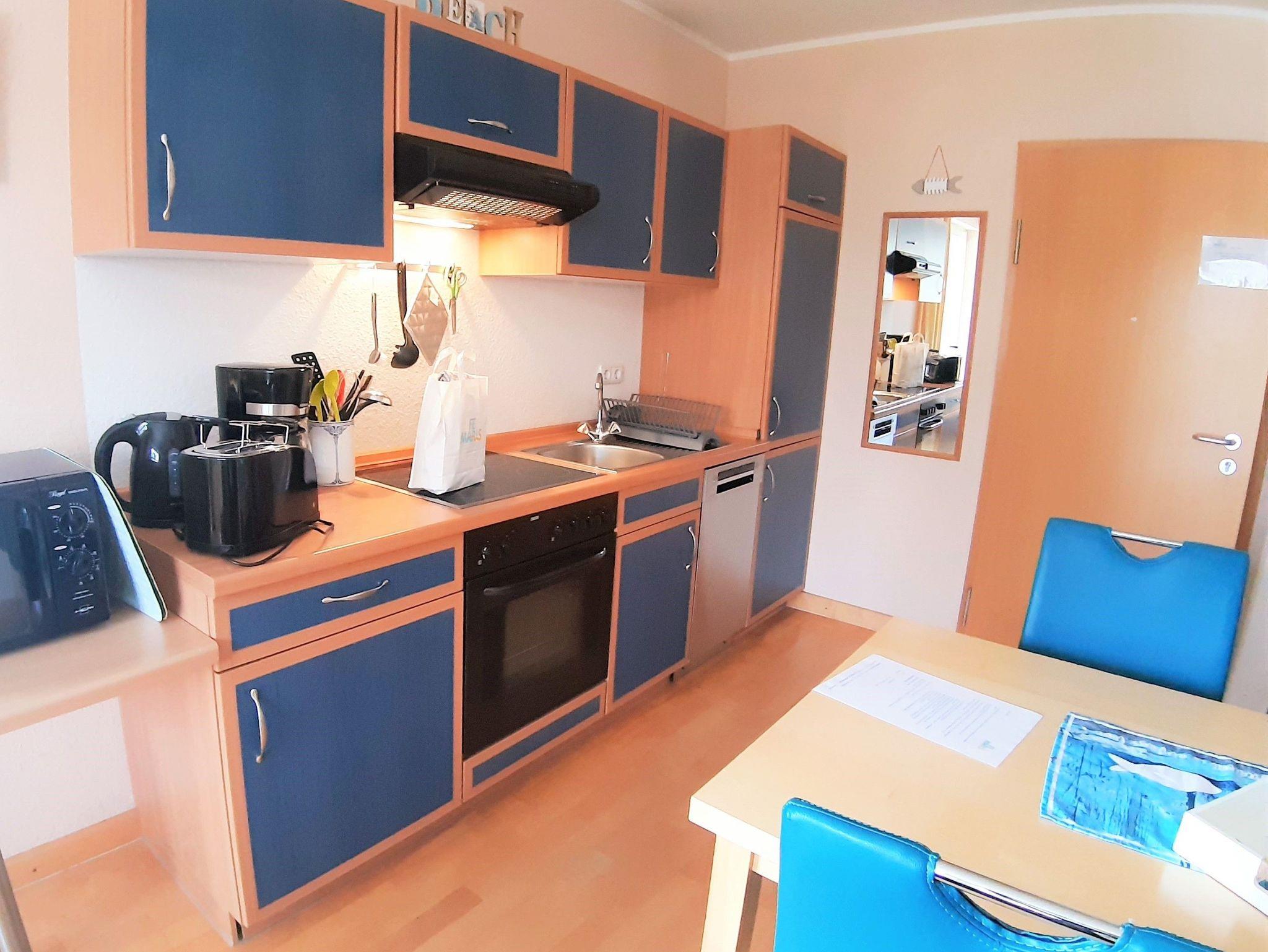Küche mit Mikrowelle, Herd mit Backofen, Kaffeefiltermaschine