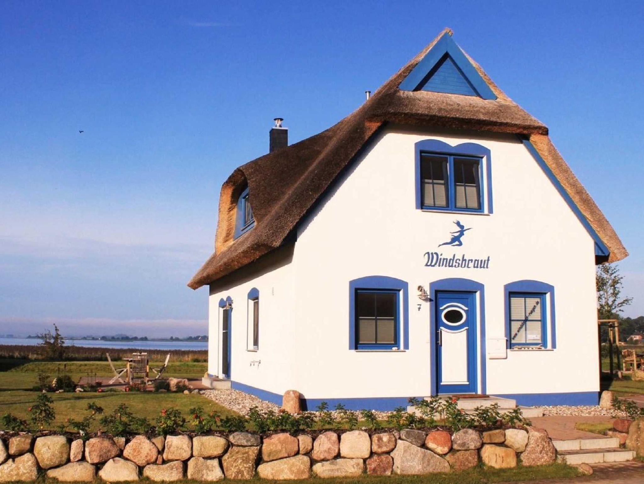 Reetdachhaus Windsbraut bietet traumhaften Panoramablick auf den Breeger Bodden mit Terrasse, Balkon und Strandkorb direkt hinter dem Deich.