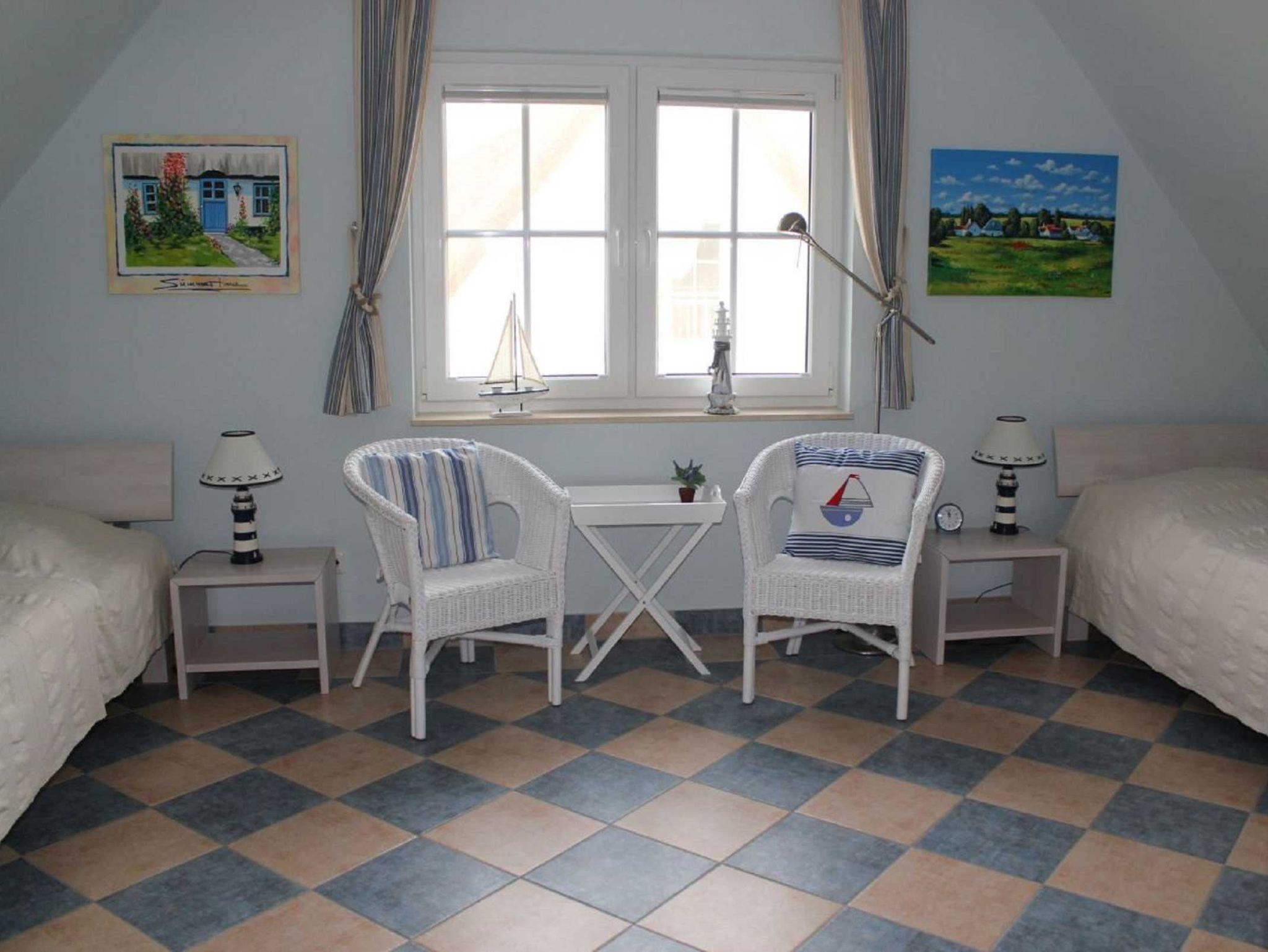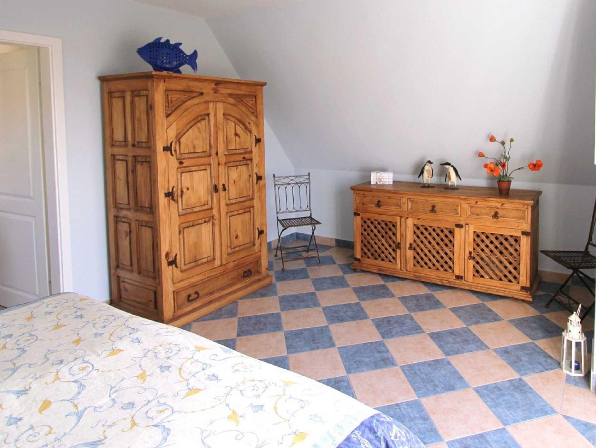 Im Obergeschoss des Hauses befinden sich zwei Schlafzimmer für insgesamt vier Personen. Diese sind liebevoll und charmant eingerichtet. In jedem der Schlafzimmer befinden sich zwei Stühle zur Kleiderablage sowie ausreichend Schrankraum, so dass Sie auch im Urlaub reichlich Platz für Ihre Garderobe haben.