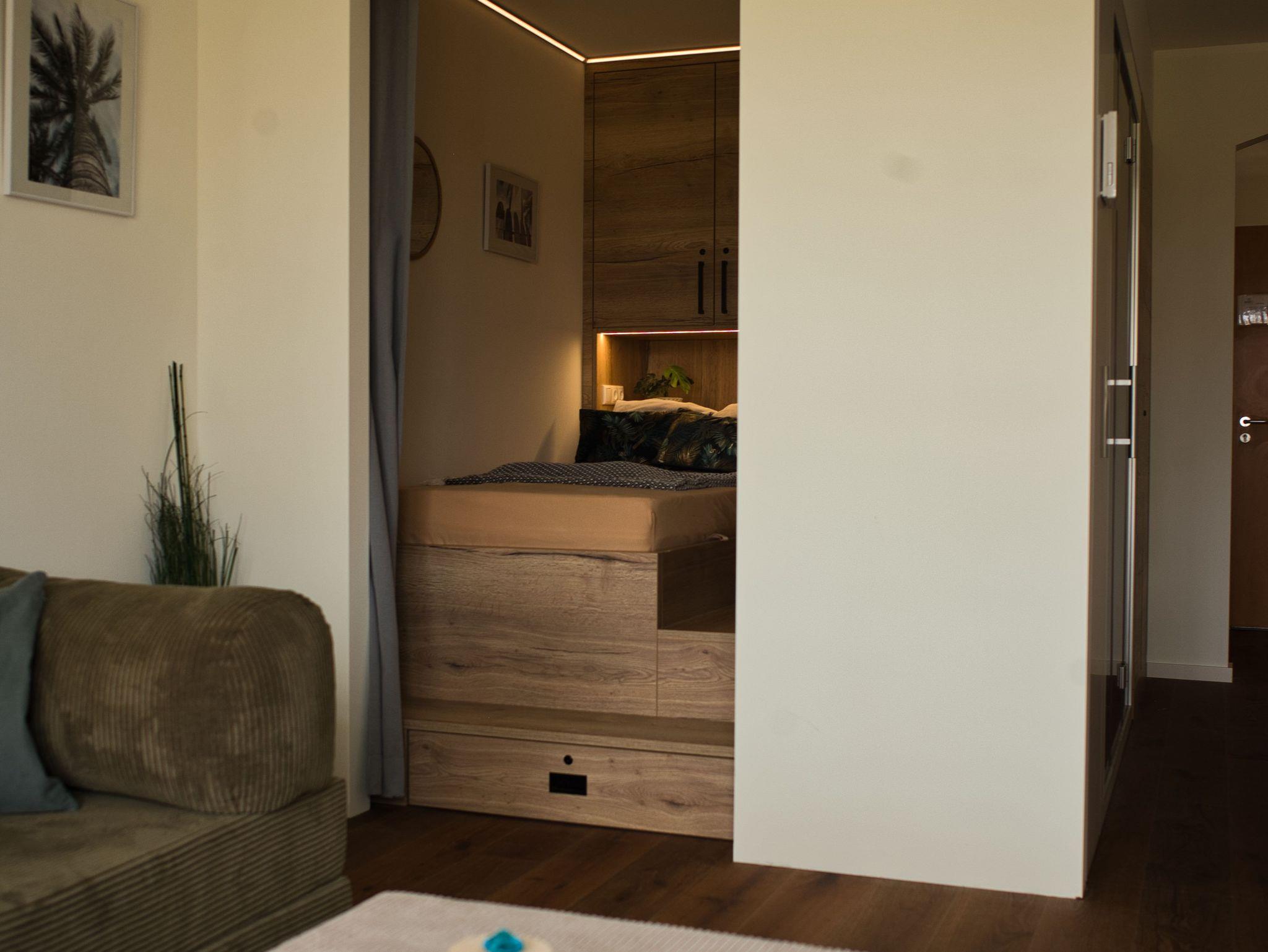 Das separate Schlafzimmer ist mit einem großzügigen Doppelbett (180 x 200 cm) ausgestattet. Ergänzend steht eine abgetrennte Schlafnische mit einem Bett (100 x 200 cm) zur Verfügung ? ideal für ein Kind oder eine weitere Person.