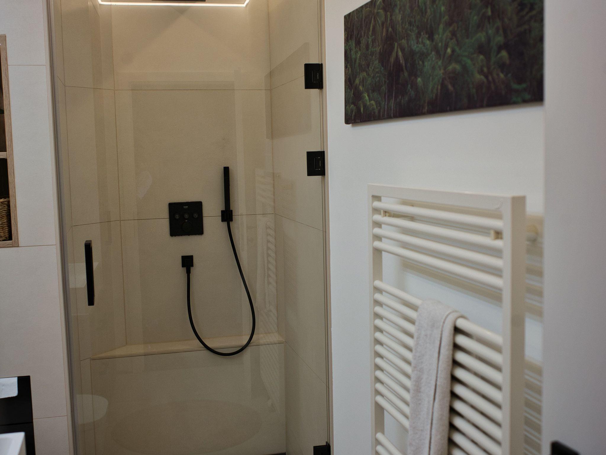 Das Badezimmer ist modern gestaltet und mit einer Dusche ausgestattet.