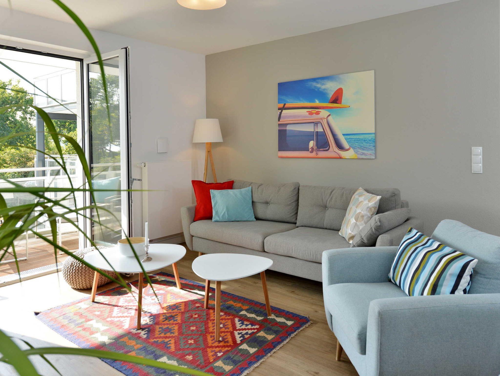 Strandwohnung Wassermusik in Juliusruh bietet Balkon mit Meerblick und moderne Ausstattung direkt an der Schaabe.
