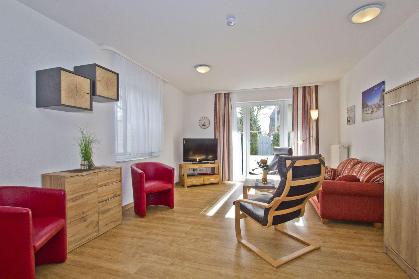 WOHNEN // Wohnraum mit Essbereich, Sitzgarnitur mit bequemer Couch, Wandbett 140x200, Kabel-TV, Radio, CD-Player ++