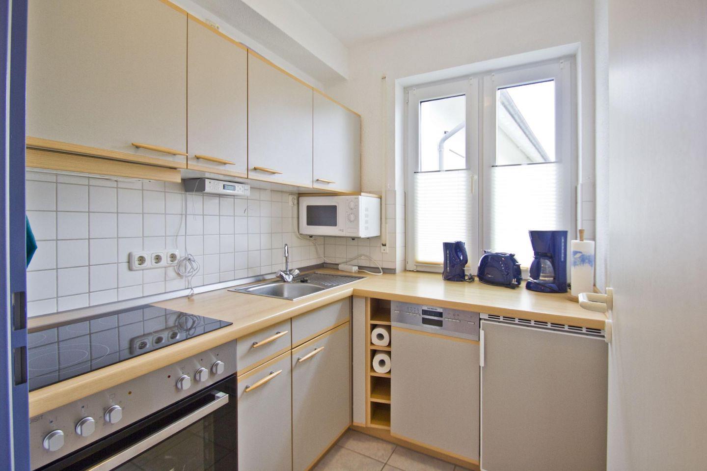 KÜCHE // separate Küche, 4-Platten Herd, Spülmaschine, Kühlschrank mit Gefrierfach, Backofen, Mikrowelle, Toaster, Wasserkocher, Kaffeemaschine, reichlich Besteck, Geschirr und Küchenutensilien ++
