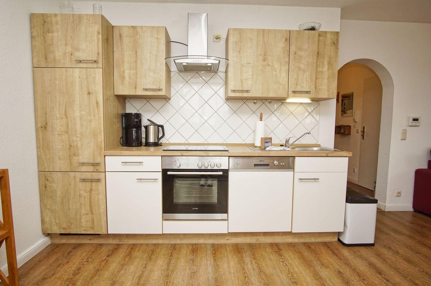 KÜCHE // offene Küche, 4-Felder Ceranherd, Spülmaschine, Kühlschrank mit Gefrierfach, Backofen, Toaster, Wasserkocher, Kaffeemaschine, reichlich Besteck, Geschirr und Küchenutensilien ++