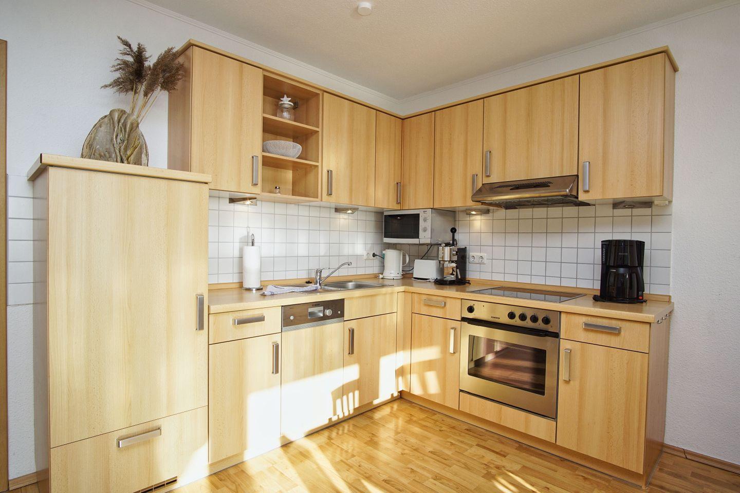 KÜCHE // offene Küche, 4-Platten Ceranherd, Spülmaschine, Kühlschrank mit Gefrierfach, Backofen, Mikrowelle, Toaster, Wasserkocher, Kaffeemaschine, reichlich Besteck, Geschirr und Küchenutensilien ++