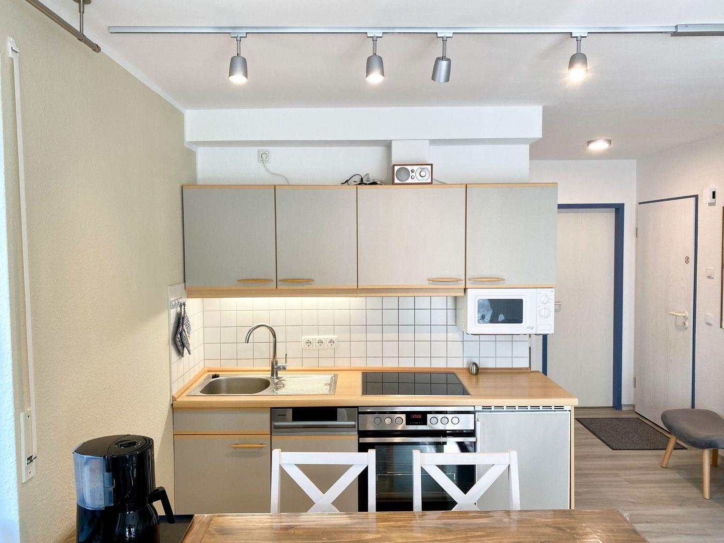KÜCHE // Küchenzeile, Ceranfeld, Backofen, Spülmaschine, Mikrowelle, Kühlschrank mit Gefrierfach, Backofen, Toaster, Wasserkocher, Kaffeemaschine, reichlich Besteck, Geschirr und Küchenutensilien ++
