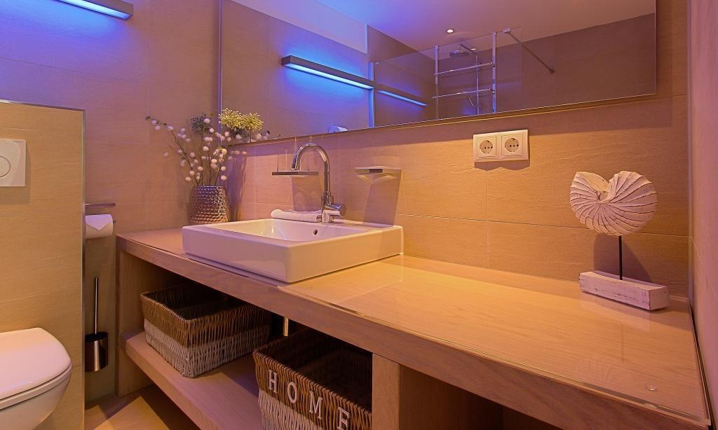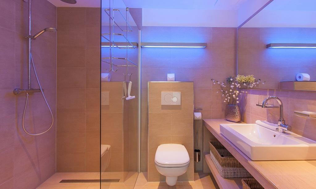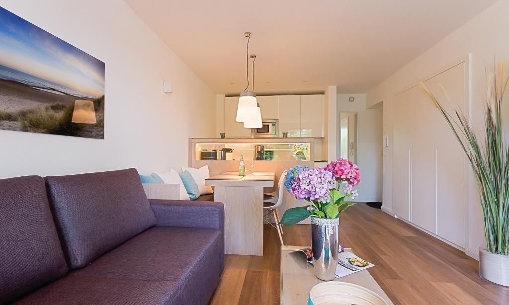 Die moderne Wohnung verfügt über einen kombinierten Wohn- und Essbereich sowie ein Schlafzimmer mit direktem Zugang zum exklusiven Bad/WC, das mit einer Zwei-Quadratmeter großen ebenerdigen Regendusche ausgestattet ist. Durch die mattierte Glastür hast du auch im Bad Tageslichteinfall. Das Schlafzimmer verfügt neben dem Doppelbett über ein sehr großzügiges Kleiderschranksystem, das sich über die gesamte Länge des Raumes erstreckt. Dadurch bietet sich viel Stauraum, auch für deine Koffer. Die Ausrichtung der Wohnung besticht durch ihre Südlage und bietet dir einen 12 m² großen Südbalkon mit weitläufigem Wiesenblick. Für absoluten Wohnkomfort steht dir sowohl im Wohn- als auch im Schlafbereich ein TV zur Verfügung, so dass gemütliches Fernsehen auch vom Bett aus möglich ist. Die voll ausgestattete Küche mit Tresen lässt keine Wünsche offen. Bei der Ausstattung wurde viel Wert auf hochwertiges Interieur gesetzt. Die Wohnung kann durch die elektrischen Rollläden komplett verschattet werden.
