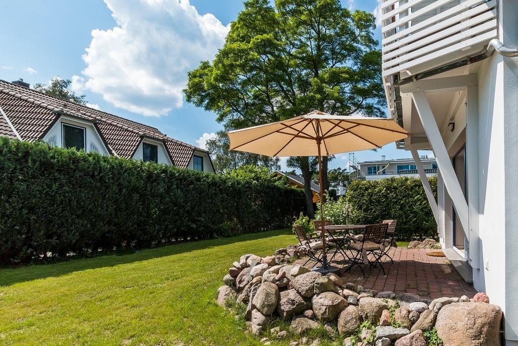 Im Außenbereich steht dir eine Holzdeck-Terrasse mit passender Bestuhlung und Sonnenschirm zur Verfügung. Dank der Heckenbepflanzung ist die Terrasse nicht einsehbar. Hier kannst du deine Ruhe und Privatsphäre genießen - so wie man es sich im Urlaub wünscht. Zudem gehört ein PKW-Stellplatz zur Ferienwohnung dazu.