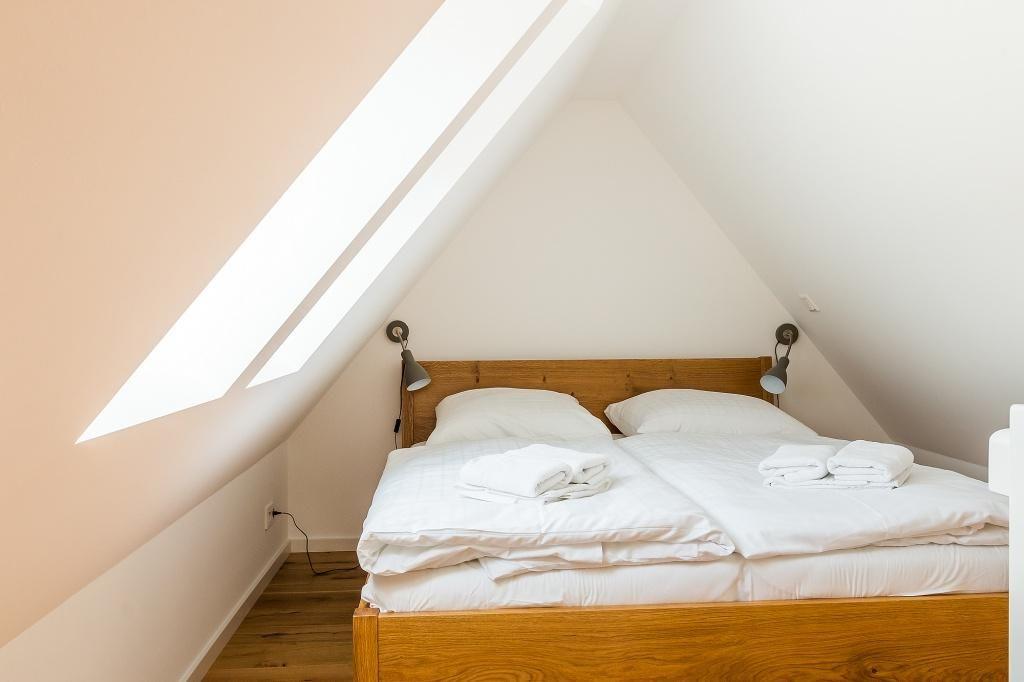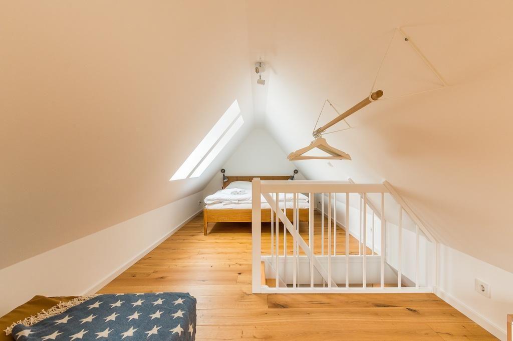Über eine etwas steilere Treppe erreichst Du das zweite offene Schlafzimmer im Dachgeschoss, welches über ein Doppelbett sowie ein weiteres Liegebett verfügt.